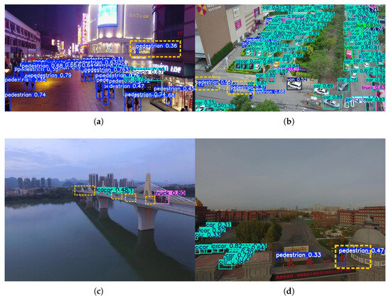 Visualization of representative false positives and missed detections by YOLO-DMF. (a) Scene 1. (b) Scene 2. (c) Scene 3. (d) Scene 4.