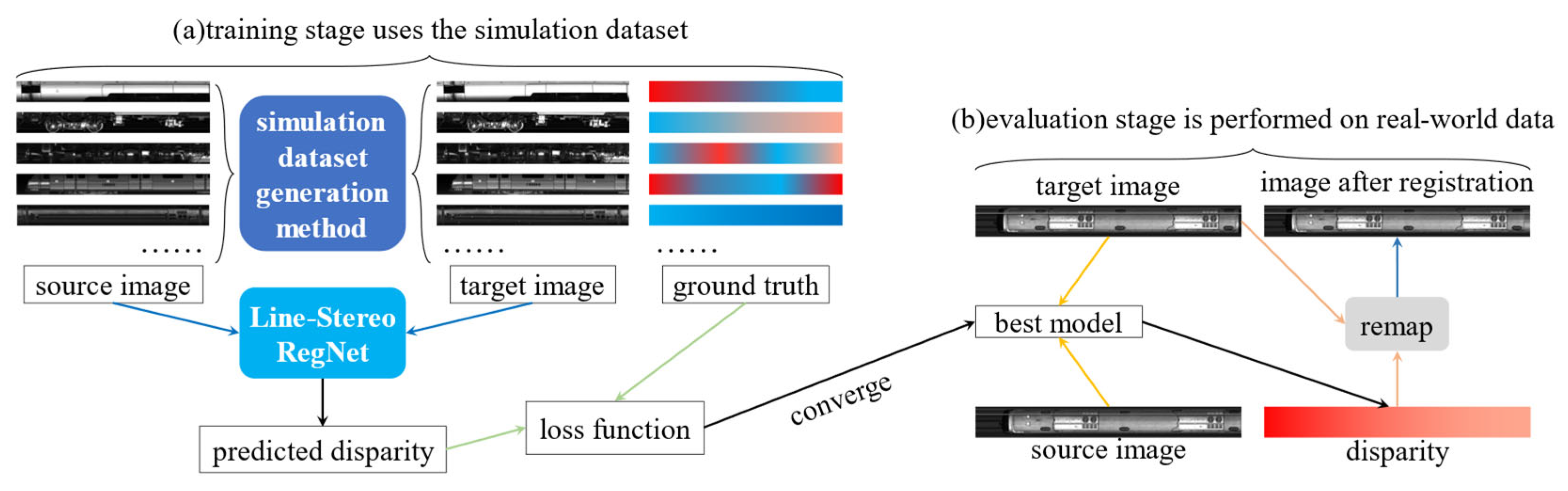 Reformulation line-scan image registration framework and performance breakthrough. By casting horizontal registration as a line-disparity estimation task and designing an efficient cost volume, our method substantially outperforms existing algorithms in both accuracy and speed, particularly in regions with weak or repetitive textures, while maintaining low memory consumption. To ensure that the estimated disparities and their induced transformations adhere to realistic train-motion characteristics, we further introduce a dual-smoothness loss function.