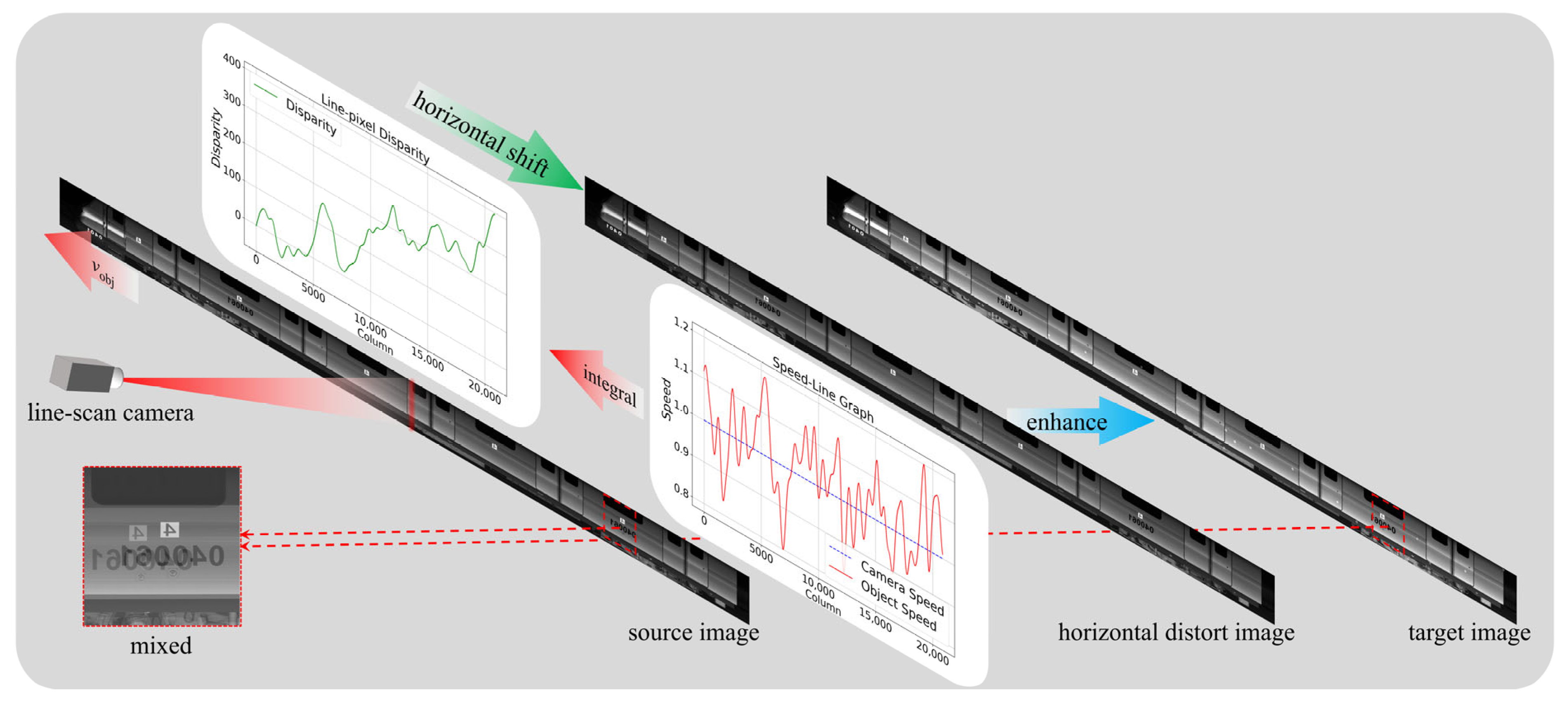 3] is that the train’s velocity is perfectly matched with the line-scan camera’s acquisition rate. While real-time adjustment of the acquisition rate can mitigate this mismatch, residual distortions or misalignments invariably arise from systematic errors in the velocity measurement apparatus [