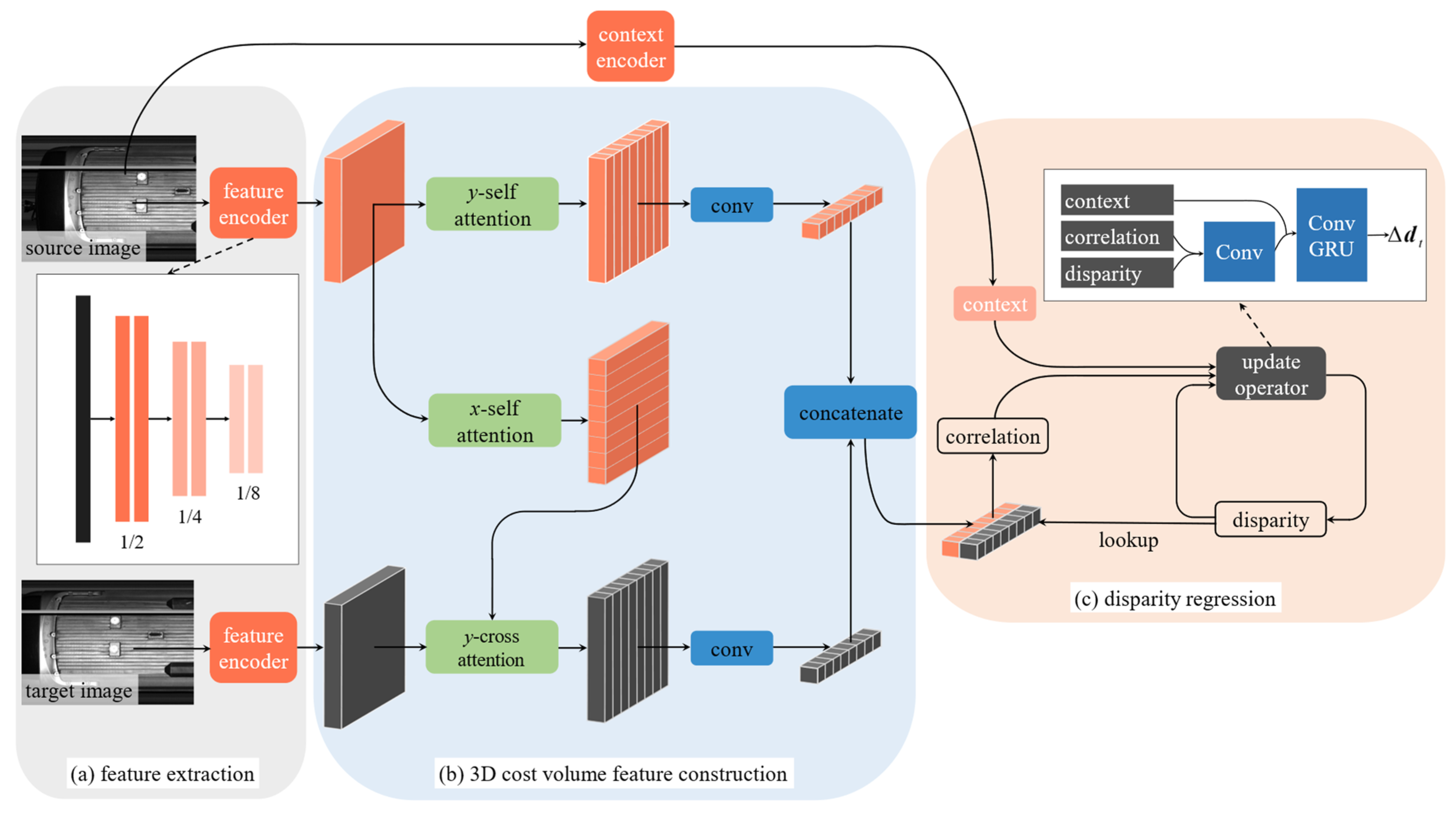 −5 per iteration, and a batch size of 4. After 10,000 steps of training, a coarse disparity-aware pretrained model is obtained. In the fine-tuning stage, images are resized to a high-resolution format of 256 rows × 16,384 pixels. The learning rate is reduced to 1.25 × 10