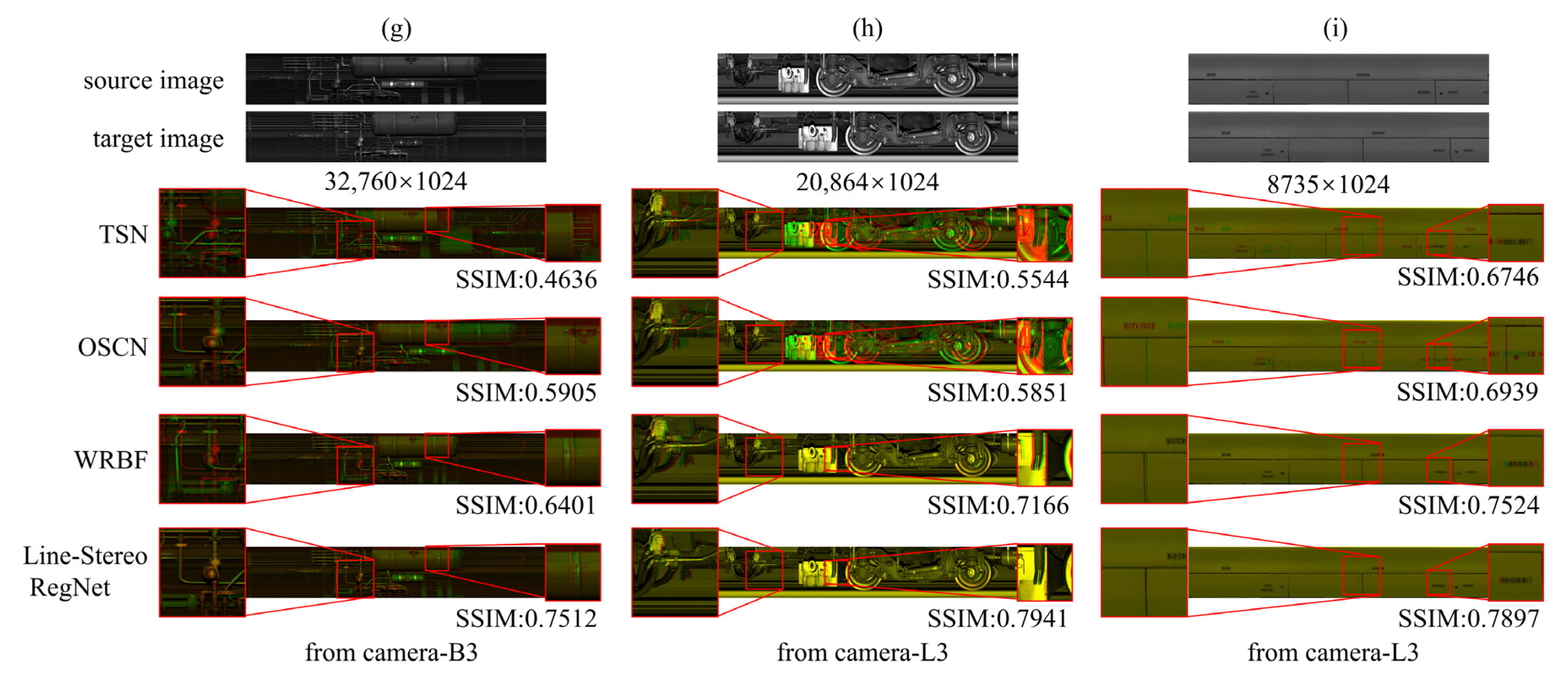 Figure 6 provides a qualitative comparison of Line-Stereo RegNet against three baselines (TSN, OSCN, WRBF) on real-world line-scan imagery. Registration accuracy is visualized by overlaying the registered red channel onto the reference green channel: yellow indicates proper alignment, while distinct red or green regions signify misalignment. Line-Stereo RegNet demonstrates robust and superior performance across most imaging conditions. In scenarios with severe nonlinear distortions (Column 1), conventional feature-point methods like TSN and OSCN exhibit significant limitations due to their reliance on piecewise affine transformations, leading to cumulative error and suboptimal solutions. Both WRBF and our method are better at modeling complex global nonlinear deformations, with Line-Stereo RegNet showing superior accuracy, particularly in wheelset regions.