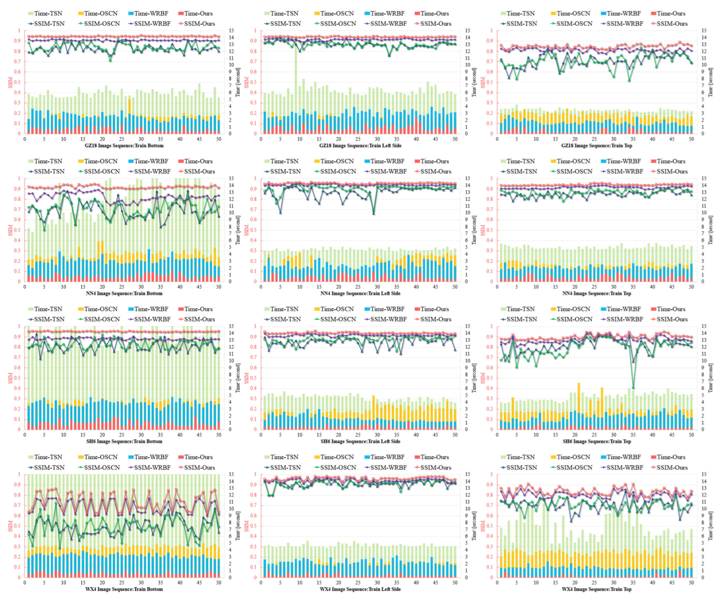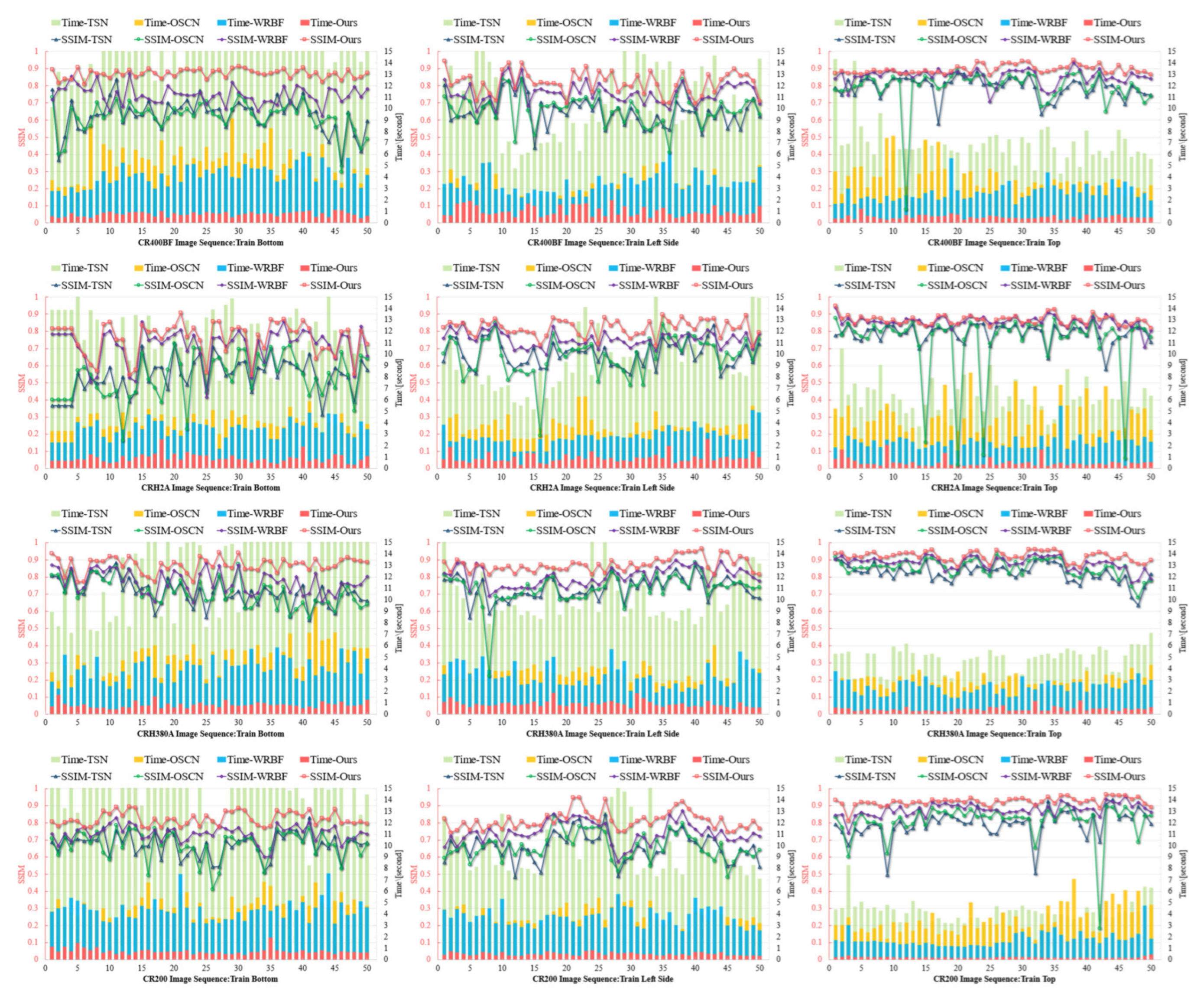 Figure 7, we used images captured at three fixed camera positions on four high-speed train models. In each subfigure, the horizontal axis represents 50 complete image pairs; the overlaid line and bar charts, distinguished by contrasting colours, depict the registration SSIM and per-pair processing time of each algorithm, respectively, with values referenced against the left and right vertical axes. The results show that TSN and OSCN demonstrated comparable registration accuracy metrics, though both exhibited fundamental limitations inherent to sparse feature-based matching paradigms. These methods consistently suffered from matching ambiguities in regions characterized by repetitive textural patterns (a prevalent condition in high-speed train exteriors, see train left side image sequence) due to their reliance on local feature point correspondences without adequate global context integration. WRBF achieved superior registration accuracy through its sliding window matching strategy, which effectively addressed some nonlinear deformation challenges. However, this approach incurred substantial computational overhead, particularly in texture-rich (train bottom image sequence) or ultra-wide format images, resulting in processing times greater than the proposed method. The proposed Line-Stereo RegNet achieved both higher precision metrics and significantly reduced processing latency. Statistical analysis revealed that Line-Stereo RegNet improves average registration error by 5.8% and the average processing time accounts for one-fourth relative compared to WRBF. These improvements demonstrate a theoretically and practically superior balance between registration fidelity and operational efficiency, particularly valuable for real-time high-speed rail inspection systems.