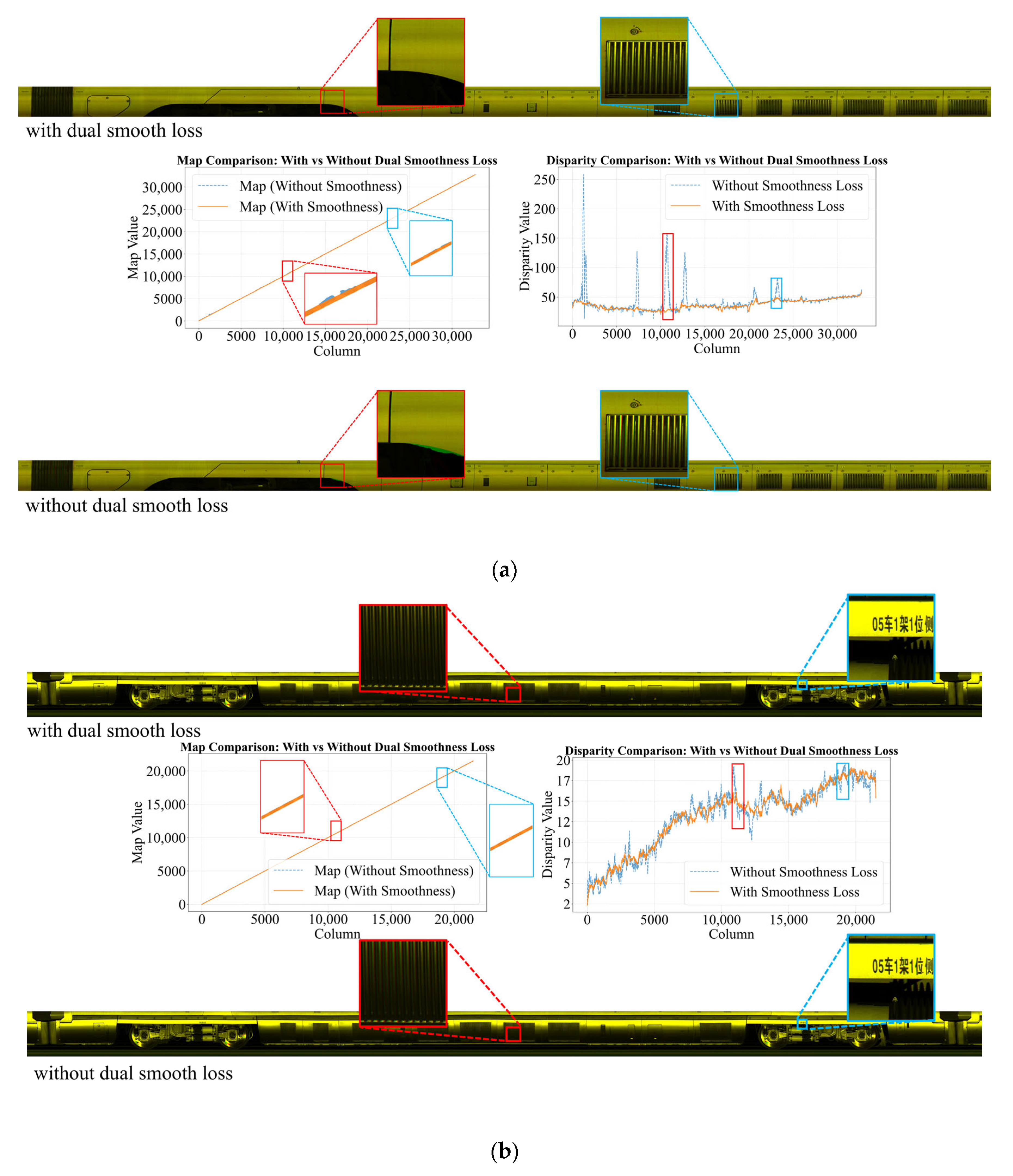 Figure 9) highlights the crucial role of the dual smoothness loss and the complementary interaction between its first- and second-order terms. The second-order term maintains motion continuity and prevents disparity jumps in repetitive-texture regions, while the first-order term suppresses noise and avoids global drift in low-texture areas [