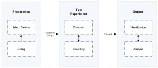 In severe cases, it may lead to equipment failure, operational safety hazards and economic losses. The mechanism of partial discharge is inseparable from the effect of high-voltage electric fields. When the electric field strength exceeds the local breakdown strength of the insulating material, electrons are accelerated in the defect area and form tiny plasmas, this process is accompanied by continuous energy release, resulting in the gradual degradation of the physical and chemical properties of the insulating material [,]. This degradation not only affects the insulation performance, but may also accelerate the aging process of the equipment and cause more serious failures, such as equipment failure or system power outages []. Therefore, early detection of partial discharge phenomena is crucial. We can understand the general process of partial discharge detection based on Figure 1.