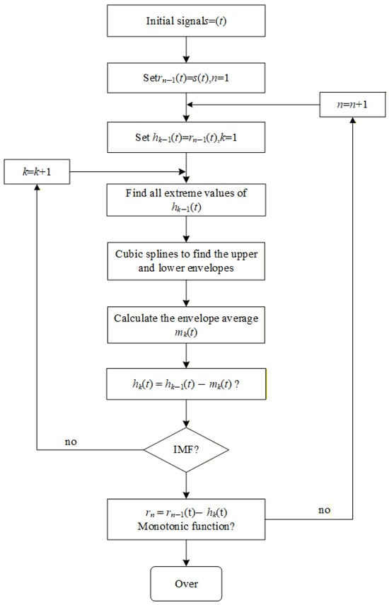 EMD is the basis of HHT, which aims to decompose the original signal into a series of intrinsic mode functions (IMFs) through a process called “sieving”. The specific process is shown in Figure 4. Each IMF must meet two conditions: (1) the number of extreme points is equal to or differs from the number of zero crossings by at most one; (2) the mean of the envelope defined by the local maxima and local minima is zero []. The sieving process first identifies all the extreme points of the signal and fits the upper and lower envelopes, respectively, using cubic spline interpolation. The difference between the original signal and the mean of the upper and lower envelopes is called the intermediate signal. This process is repeated until the intermediate signal meets the IMF conditions, thus obtaining the first IMF. This IMF is separated from the original signal to obtain the residual, and the above process is repeated on the residual until the residual is a monotonic function or a constant. Finally, the original signal is represented as the sum of several IMFs and a residual [].
