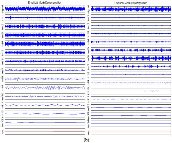 EMD and its improved algorithms (such as EEMD) can effectively reduce signal noise by screening and retaining IMFs that reflect the main signal characteristics and eliminating noise-dominated components [,]. In the presence of strong noise, combining energy threshold and sensitivity function analysis can be used to identify key IMFs and ensure accurate signal reconstruction [,].
