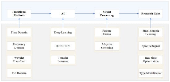 The development of partial discharge signal processing technology has followed a clear technological trajectory. In the 1990s, time-domain and Fourier-based methods dominated, providing basic but limited analytical capabilities [,,]. In the early 2000s, wavelet transform emerged in PD analysis due to its excellent time-frequency localization capabilities and became an effective tool for processing non-stationary signals [,]. By the 2010s, fully adaptive methods such as empirical mode decomposition (EMD) and Hilbert–Huang transform (HHT) became increasingly prominent due to their ability to handle nonlinear and transient signals []. In recent years, the emergence of artificial intelligence and deep learning (e.g., Convolutional Neural Network (CNN), Recurrent Neural Network (RNN)) has completely changed the PD analysis paradigm, enabling end-to-end feature learning and automatic diagnosis, and achieving breakthrough progress in classification accuracy []. However, in practical engineering applications, the monitoring and analysis of PD signals face numerous challenges. First, the complex electromagnetic environment at the site makes PD signals easily obscured by strong background noise (such as carrier communication and random pulse interference), posing a primary challenge to reliable signal extraction. Second, PD signals themselves are non-stationary and transient, and different types of discharges (such as internal discharge and surface discharge) have varying physical mechanisms and time-frequency characteristics, making it difficult for general signal processing models to achieve accurate identification. Furthermore, power equipment condition monitoring demands high real-time performance, but there is a significant contradiction between limited on-site computing resources (especially on embedded edge devices) and complex signal processing algorithms. These challenges in engineering practice are the fundamental driving force behind the evolution of signal processing methods from traditional analysis to adaptive time-frequency processing, and then to an intelligent hybrid paradigm. This review traces this evolution and systematically compares each paradigm to identify its advantages, limitations, and future synergies.
