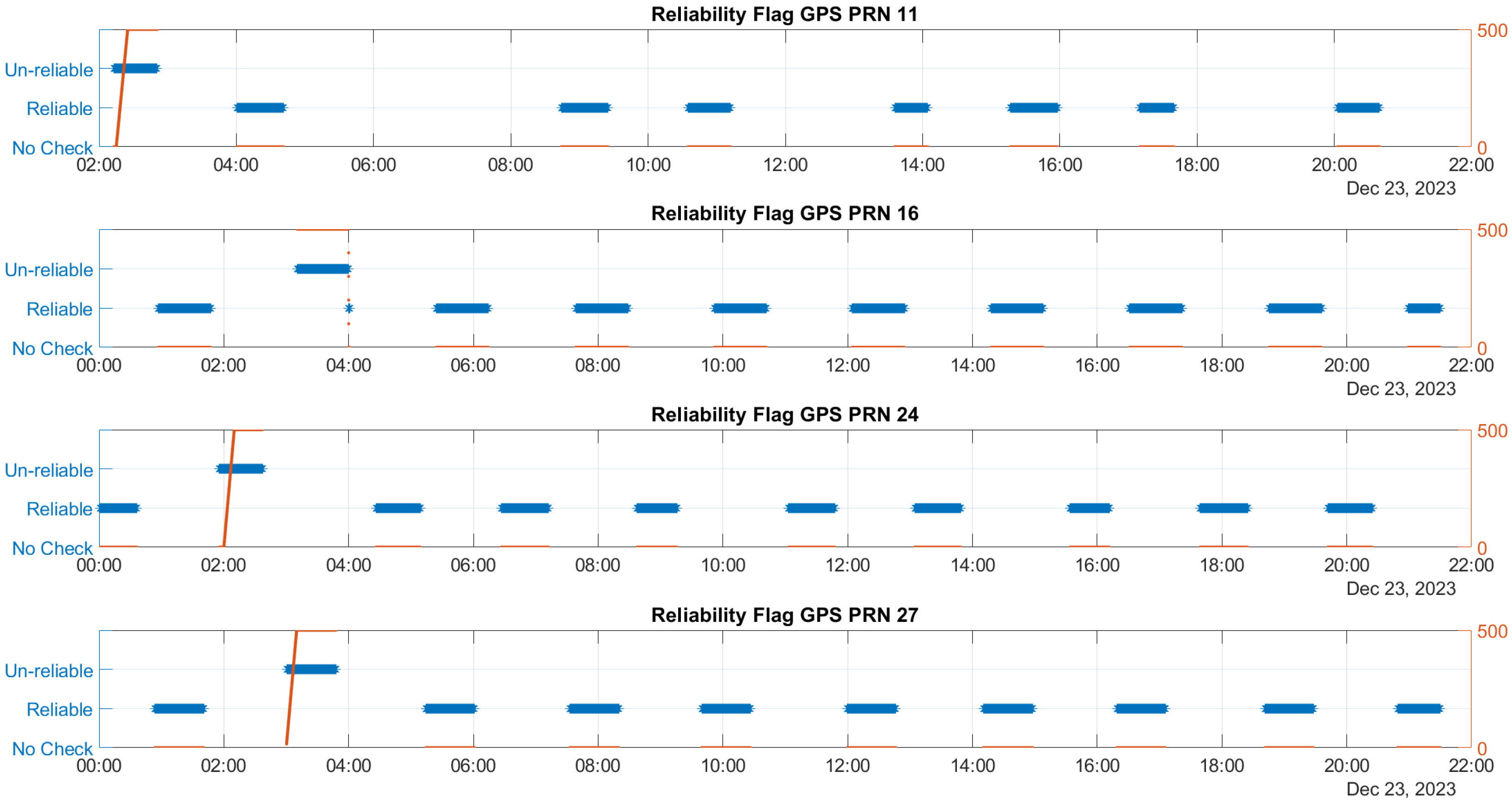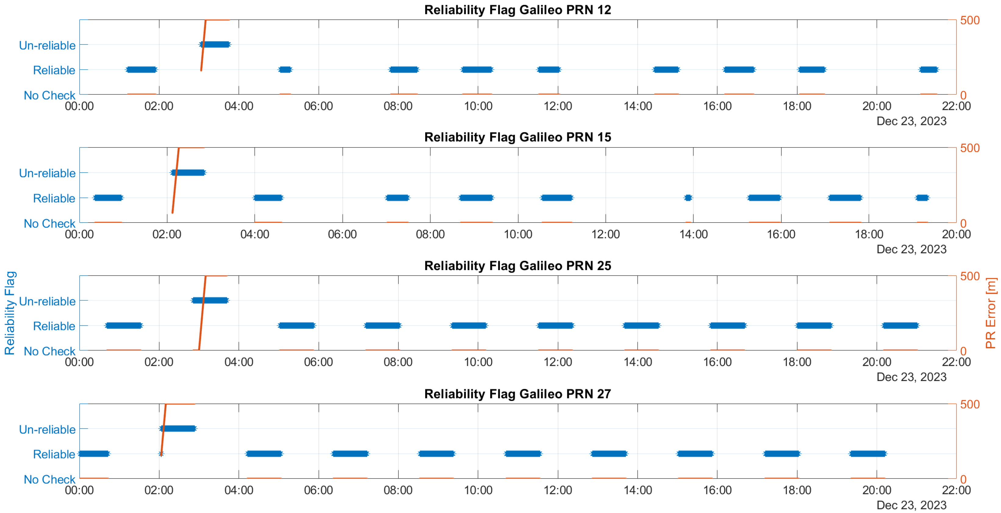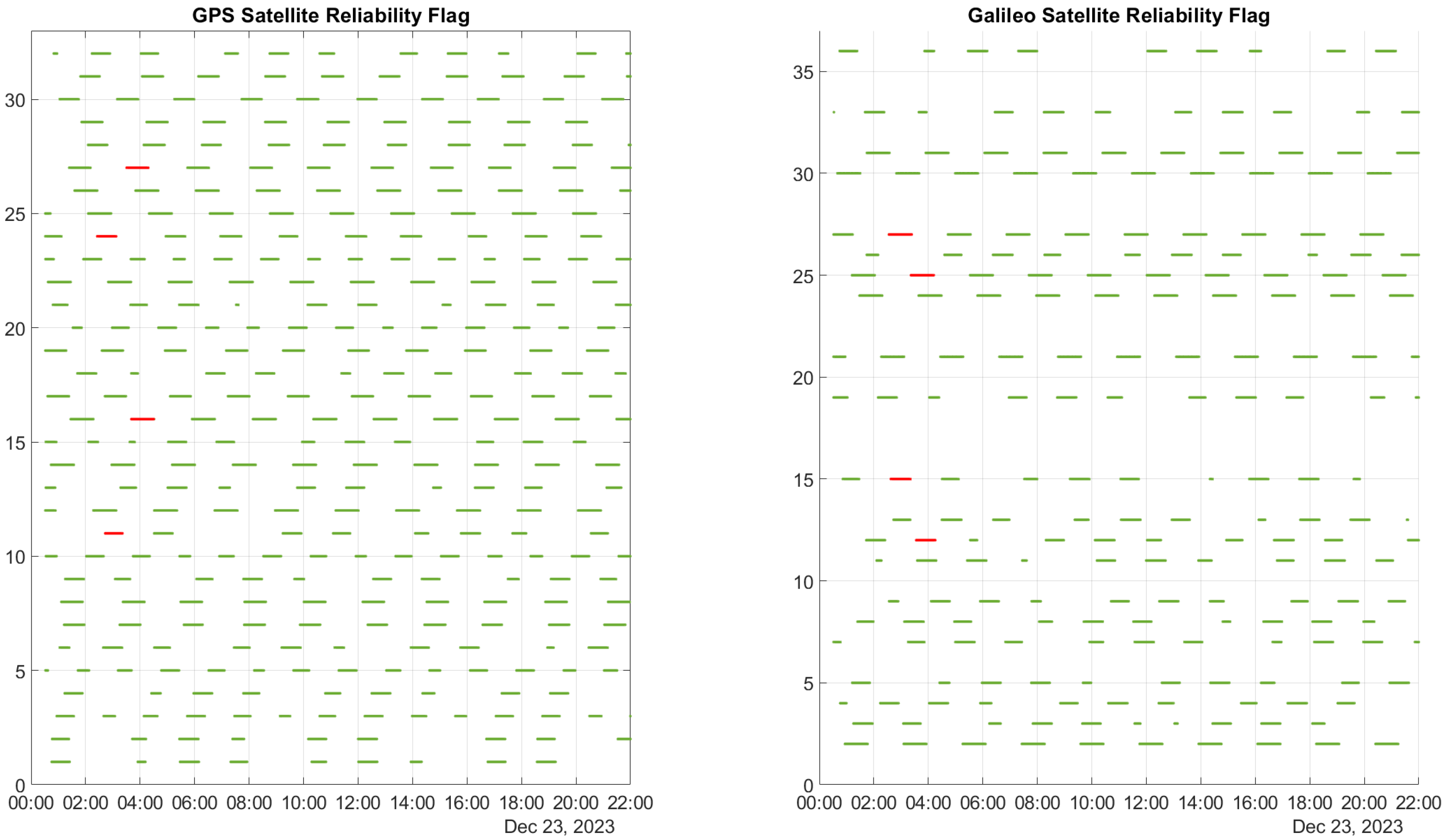 Figure 3, the reliability flag determined by the T-RAIM algorithm is displayed for all satellites, with the GPS data on the left and the Galileo data on the right. A green marker signifies that a satellite is deemed reliable and can be included in the navigation solution, whereas a red marker indicates that a satellite is identified as a blunder and is therefore excluded from the navigation solution. The figure reveals that the algorithm only excludes satellites during the activation of ramps, accurately identifying those affected. Throughout the rest of the test, no satellites are excluded.