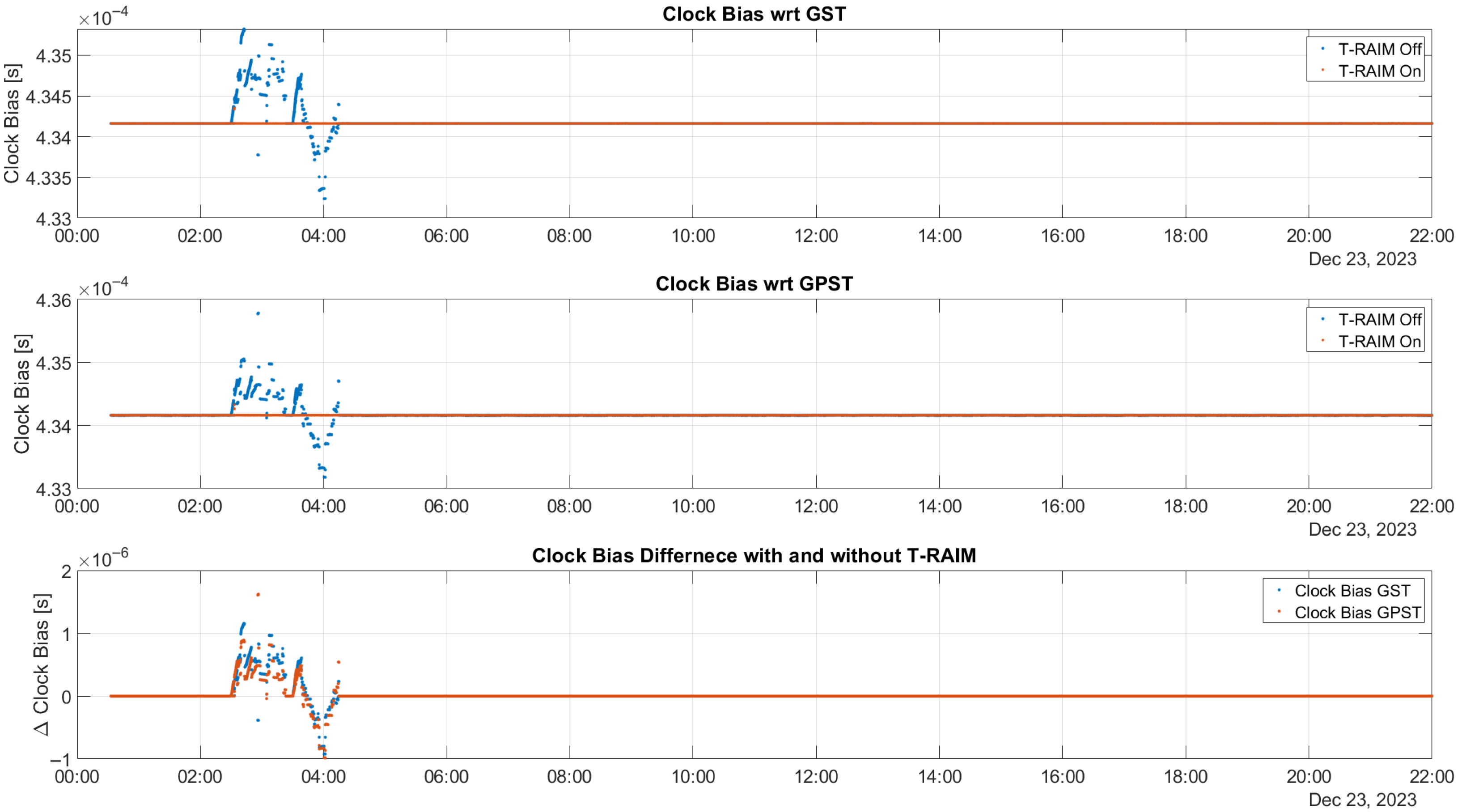 Figure 6. In this study, the receiver clock bias is estimated for the multi-constellation considering two clock biases: one with respect to GPS time (GPST) and the other one with respect to Galileo System Time (GST). The top box of the figure shows the time evolution of the clock bias relative to GST, while the middle box considers the case for GPST. In both plots, the blue dots represent estimated values without the activation of T-RAIM, and the red markers denote the estimated values when T-RAIM is activated. In the lower box, the differences between the estimated values with and without T-RAIM are shown for GST (blue dots) and GPST (red dots). The figure shows that the estimation of clock biases is strongly affected during the activation of ramp errors for both the GPS and Galileo cases. In contrast, when T-RAIM is activated, the clock biases maintain their stability. Throughout the test, the difference between clock biases estimated with and without T-RAIM remains at zero, except for the periods when ramp errors are active. During these times, the difference can reach 1 microsecond, which can cause interruptions in the LEO-PNT service. This highlights the effectiveness of T-RAIM in maintaining clock bias stability and mitigating the impact of ramp errors on LEO-PNT services.