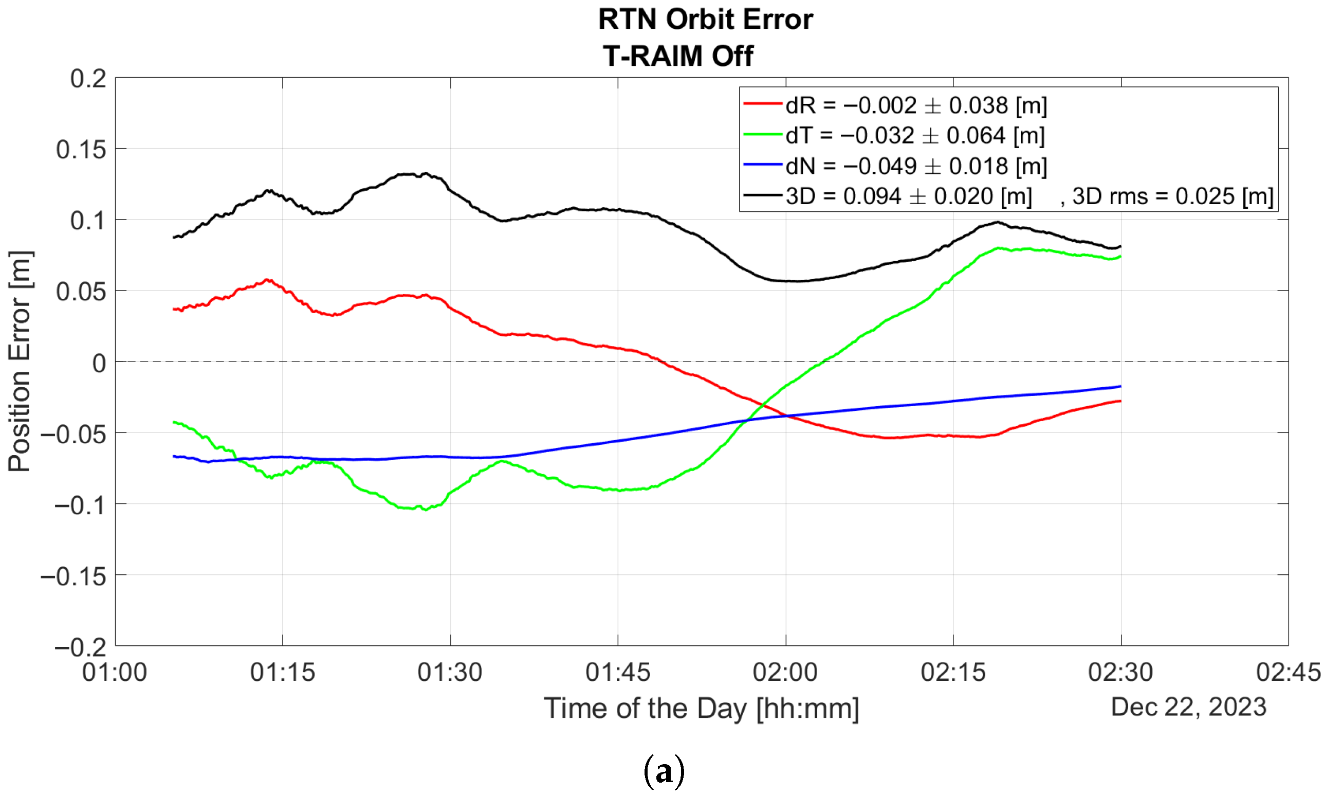 Figure 7 illustrates the time evolution of orbit error over the entire test duration, calculated in the Radial, Transverse, and Normal (RTN) reference frame with T-RAIM disabled. The figure highlights the P2OD solution’s divergence when one or more PR errors are present. The first hour is excluded from all P2OD plots to bypass the initial convergence phase, focusing instead on nominal operating conditions of the LEO-PNT payload.