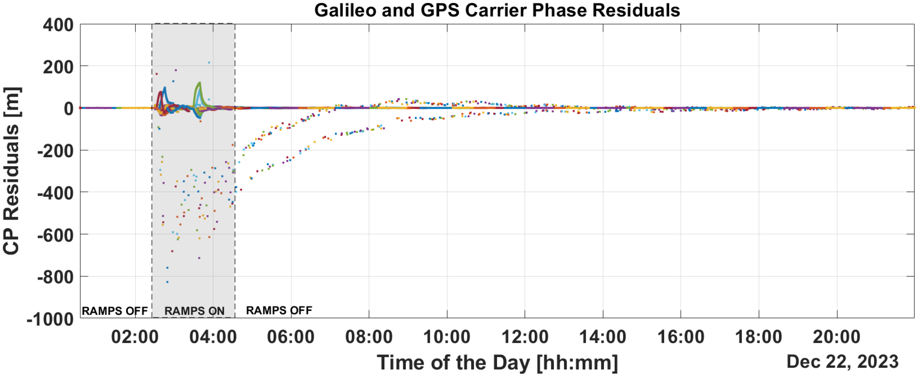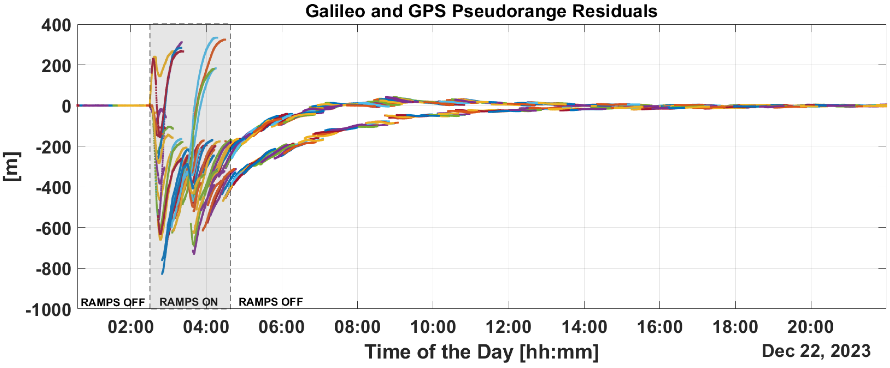 Figure 10 show the time evolution of PR and CP residuals during fault injection. These figures highlight the rapid spread of errors from the fault across all residuals. Both the PR and CP residuals exceed values of 500 m. The filter fails to mitigate the impact of these outliers, and even after the PR ramps are disabled, significant errors persist in the residuals which only diminish after a period of eight hours.