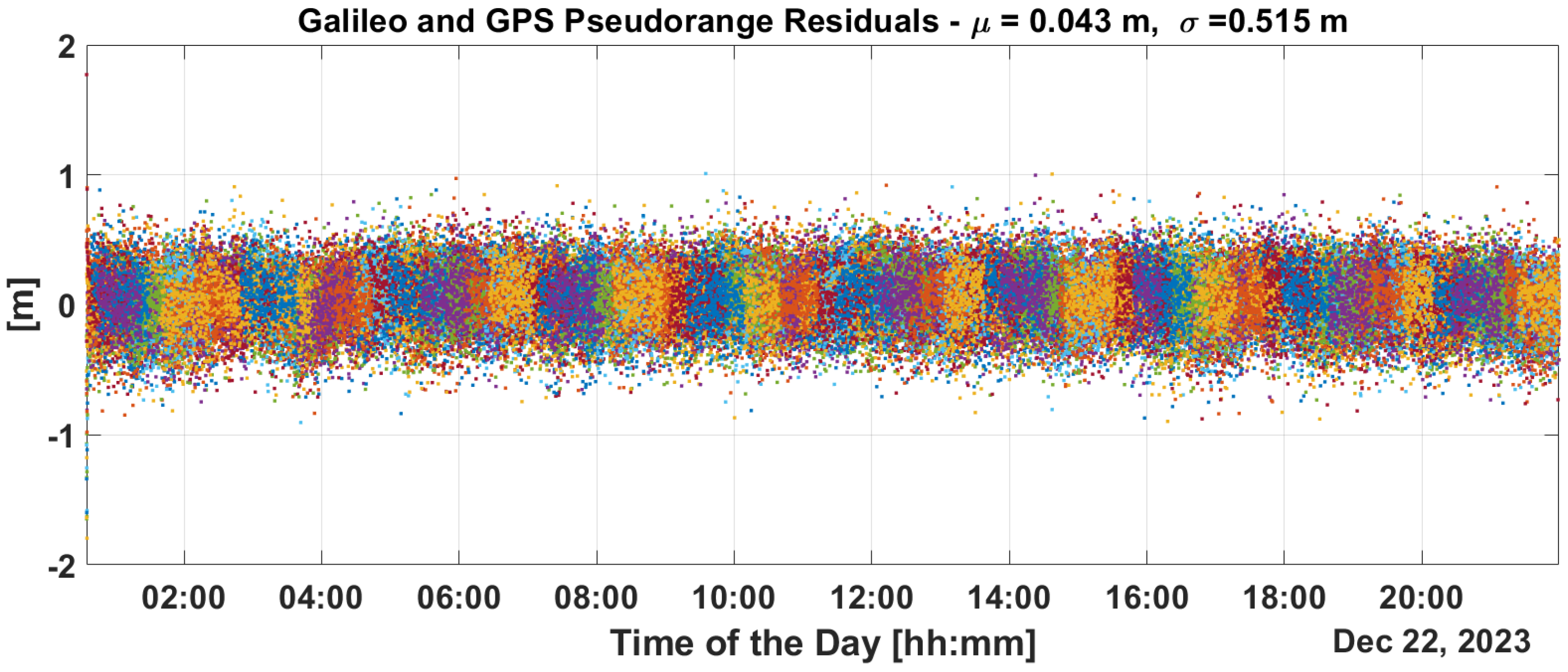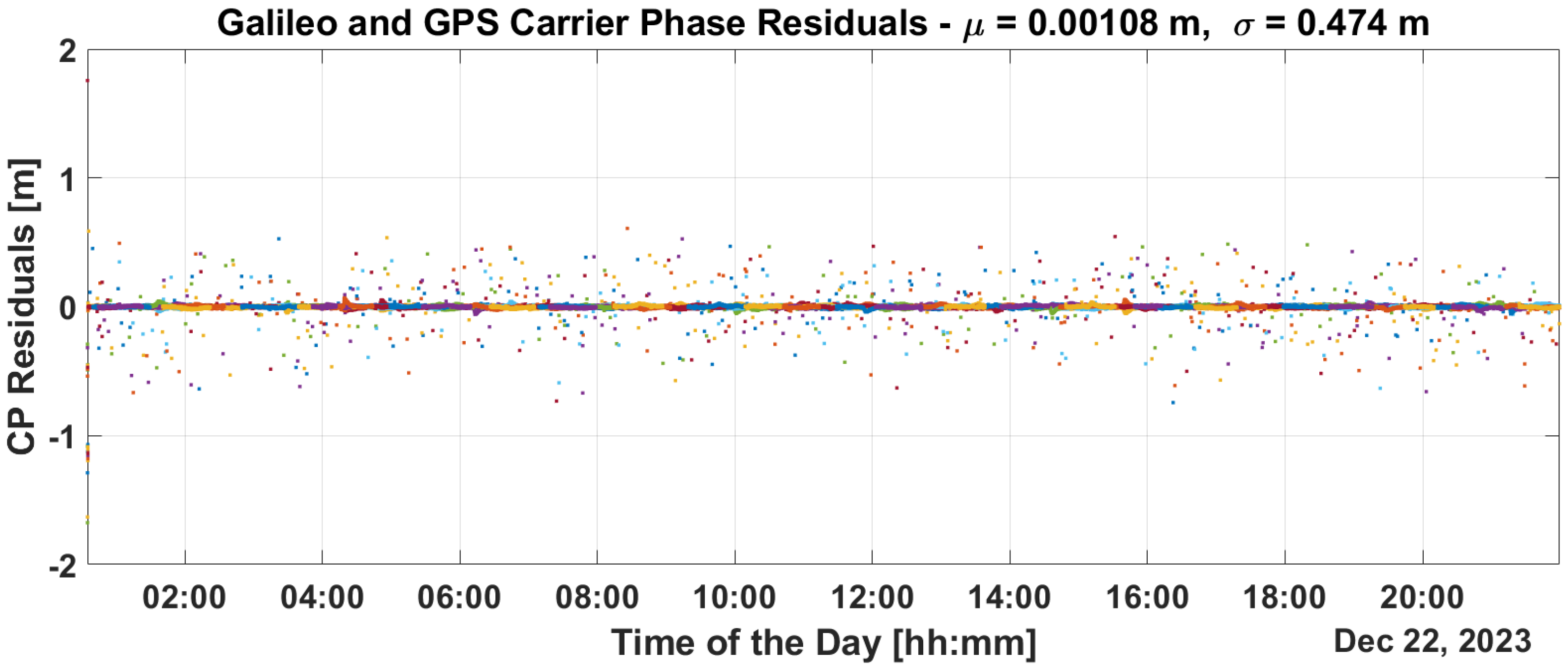 Figure 14. From the figures, it can be noted that PR and CP residuals remains at the decimeter and millimeter levels, respectively.
