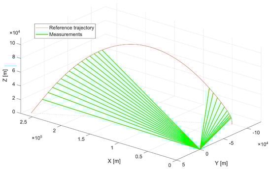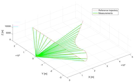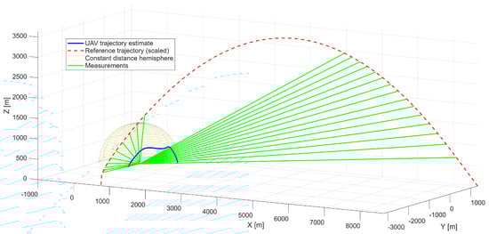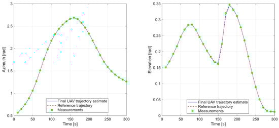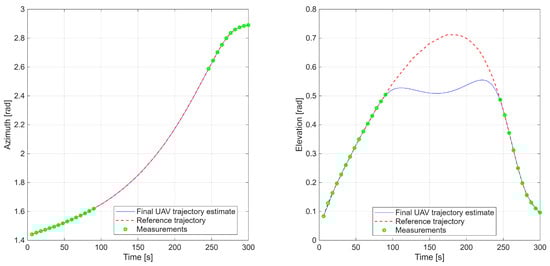 Conceptually our method differs from conventional UAV trajectory-planning frameworks such as polynomial-optimization methods, sampling-based (A, RRT*, RRT*-Smart) [44,45], and learning-based planners (e.g., DDPG) [46]. These methods assume a free decision space and optimize an objective function related to path length, dynamic feasibility, or smoothness. In contrast, in radar-environment simulation scenarios, the admissible trajectory is effectively unique because it is fully constrained by the underlying measurement geometry and by the timestamps of the radar-derived azimuth and elevation samples. The goal is therefore not to generate an optimal path, but to reconstruct the trajectory that fully satisfies the spatial–temporal constraints imposed by the measurement sequence.