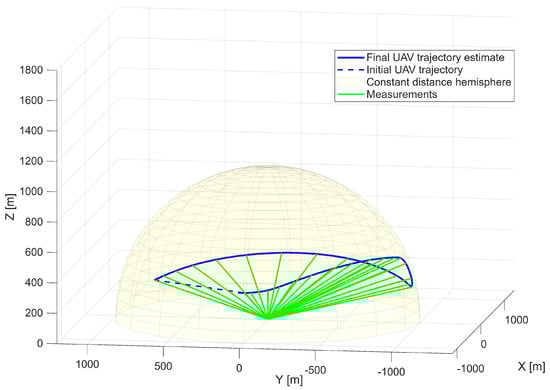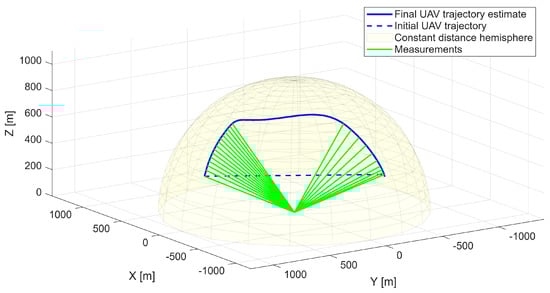 Optimized UAV trajectory on the surface of the constant distance hemisphere—first scenario.