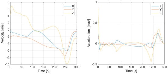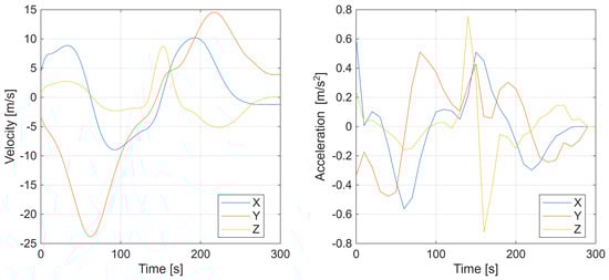Additional results, in Figure 6, depict the UAV velocity and acceleration components along the X, Y, and Z axes, confirming smooth dynamic behavior and continuity of motion. Overall, the first experiment demonstrates that the factor graph-based optimization effectively reconstructs both spatial and temporal characteristics of a maneuvering target.