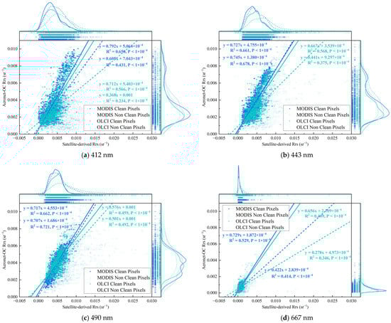 Correlation between satellite and ground-based Rrs data. This scatter plot compares satellite-derived products against AERONET-OC reference data. Data points from MODIS and OLCI are color-coded in blue and green, respectively. Open circles denote non-clean pixels, while filled circles represent clean pixels. Solid and dashed lines correspond to clean and non-clean pixels, respectively. Each data group is fitted with a regression line, whose equation is provided alongside the R2 and p-value to quantify the agreement.