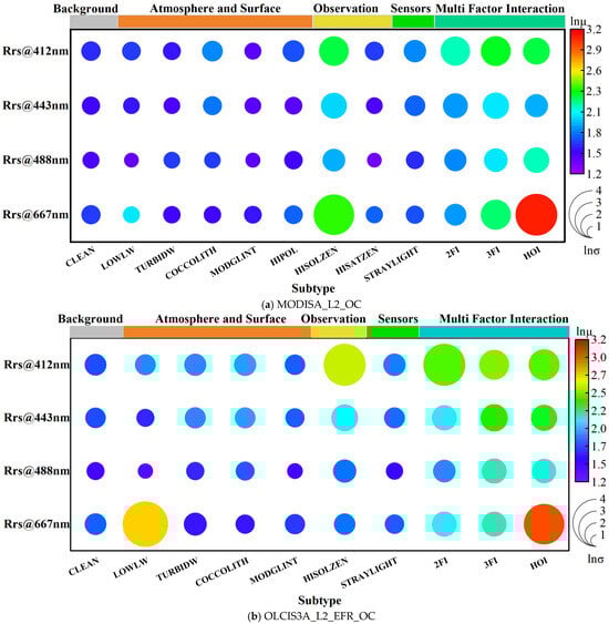 Figure 4 presents the statistical characteristics of the rd of Rrs in logarithmic form for each wavelength and error source. Apart from the clean pixels defined as the “Background” type, the error sources in the current sample sets of the MODIS and OLCI products (described in Table 2) altered the mean and standard deviation of the rd of Rrs by acting either independently or interactively. The interactive effects were further subdivided into Two-Factor Interactions (2FIs), Three-Factor Interactions (3FIs), and Higher-Order Interactions (HOIs, representing interactions of four or more error sources) based on the number of contributing error sources.