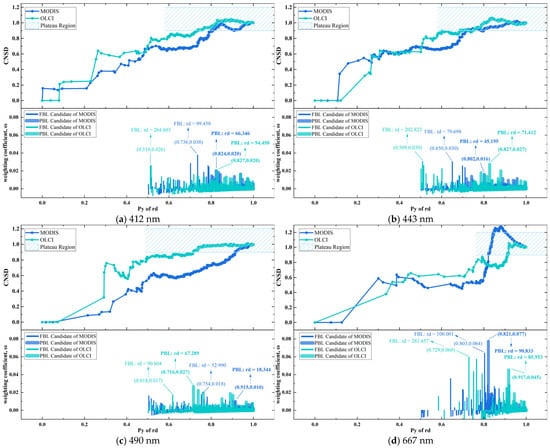 Moreover, Figure 5 shows the envelope reflecting the PSMI peak concentration, baselines such as PBL and FBL that characterize the sample distribution, and the window demarcating the PBE. Specifically, the envelope range, derived using the method described in Section 3.3.1, can be transformed into cumulative range ratio functions. This transformation allows for the calculation of the key metric, RS-IRCI, visualized in the energy-level diagram in Figure 6. The extraction of the PBL and FBL (see Figure 7) enables the determination of the PBE window by identifying the “flat” intervals in the rd range. Currently, the PBE window establishes the benchmark for quantifying the PBE. Figure 6 shows the use of RS-IRCI values to assess the concentration degree of the PSMIRD peaks for the two satellite products. The curves represent the cumulative range ratio functions, which exhibit normalized results and a monotonically increasing transition form. The area under the curve relative to the x-axis is the RS-IRCI. A smaller RS-IRCI value indicates a more concentrated deviation peak and a more significant pixel spatial response. The data showed that the RS-IRCI ranges for MODISA_L2_OC and OLCIS3A_L2_EFR_OC were 0.326–0.429 and 0.283–0.426, respectively, both below 0.5; thus, these values fall within an acceptable concentration interval according to the definition of the RS-IRCI and in comparison with Figure S2. Overall, the RS-IRCI indicated considerable aggregation effects around the dominant rd peak in the PSMI profiles of both satellite products. However, the deviation peaks for MODISA_L2_OC were more concentrated, suggesting a more pronounced pixel spatial response.