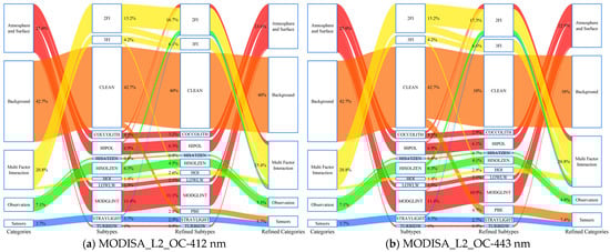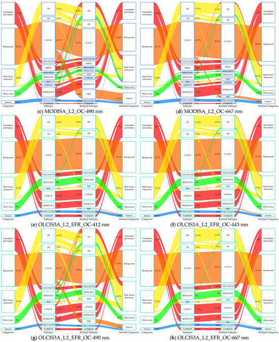 Figure 8 presents the error source migration results after introducing the PBE assessment. The two left columns show the original error types and identifiers for the samples, whereas the two right columns show the error types and identifiers after PBE assessment. The proportion of samples induced by the PBE varied with the detection band. For 412, 443, and 490 nm, the proportions for MODIS were 7.4%, 10.7%, and 20.6%, whereas for OLCI, they were 2.2%, 3.5%, and 14.2%, respectively. At 667 nm, the proportion induced by the PBE was minimal for both products, at 6.7% and 1.6%, respectively, which is closely related to the narrower W at this band.