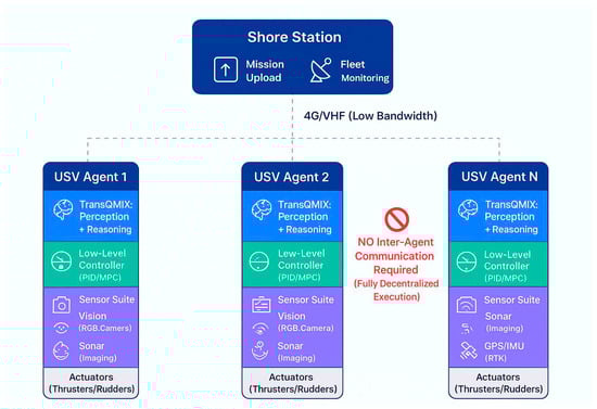Before delving into the algorithmic details of TransQMIX, we establish the practical system architecture and operational assumptions that ground our framework in real-world maritime deployments. This systems-level perspective clarifies how our perception and coordination algorithms interface with physical USV platforms, sensor hardware, communication infrastructure, and low-level control systems.