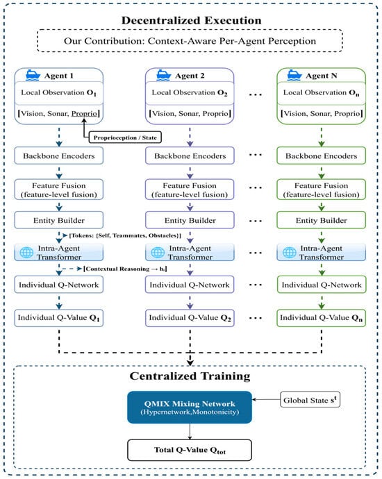 Under CTDE, value-decomposition (VD) methods address credit assignment by factoring the joint action-value into per-agent utilities. Value-Decomposition Networks employ a linear summation, which is simple but limited for tightly coordinated behaviors [20]. QMIX introduces a nonlinear, state-conditioned mixing network with a monotonicity constraint that guarantees the Individual-Global-Max property and enables decentralized greedy execution at test time [21]. Follow-ups relax or refine this factorization: QTRAN learns a more general transformation between individual and joint values [22]; QPLEX adopts a dueling-style advantage decomposition for joint action-values [23]; Weighted QMIX integrates attention-like weighting inside the mixer [24]. These advances motivate retaining a monotonic CTDE mixer for stability while strengthening the per-agent perception front-end to cope with multi-modal uncertainty—precisely the role of our design in Section 3.