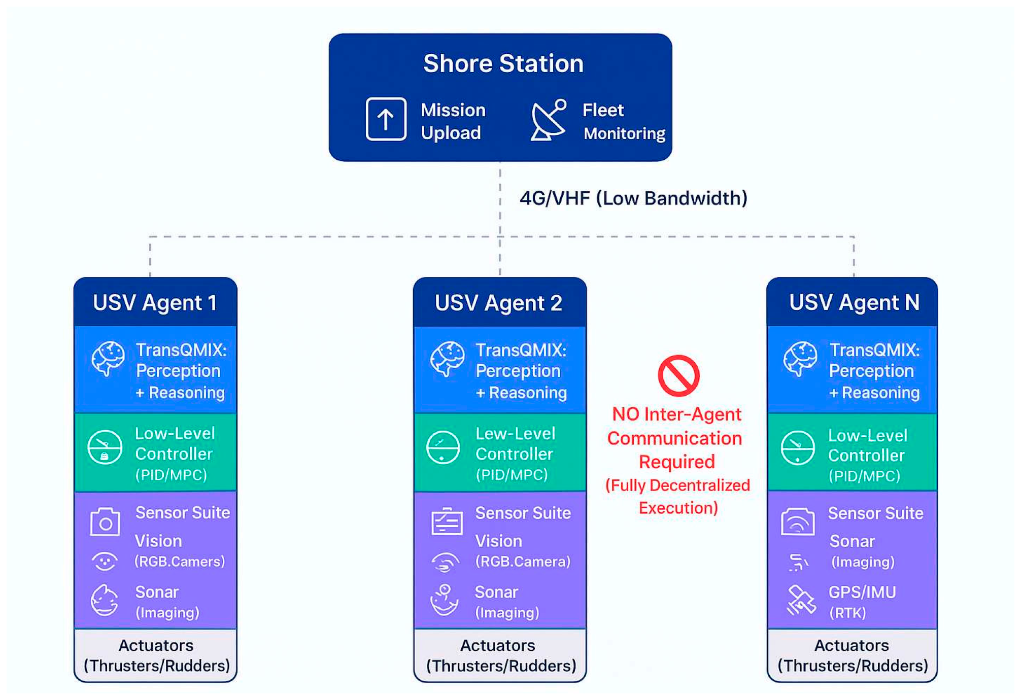 - Data Requirements: Minimal-periodic position beacons (10 bytes @ 1 Hz) and mission status updates (100 bytes @ 0.1 Hz), totaling <5 kbps per vessel.