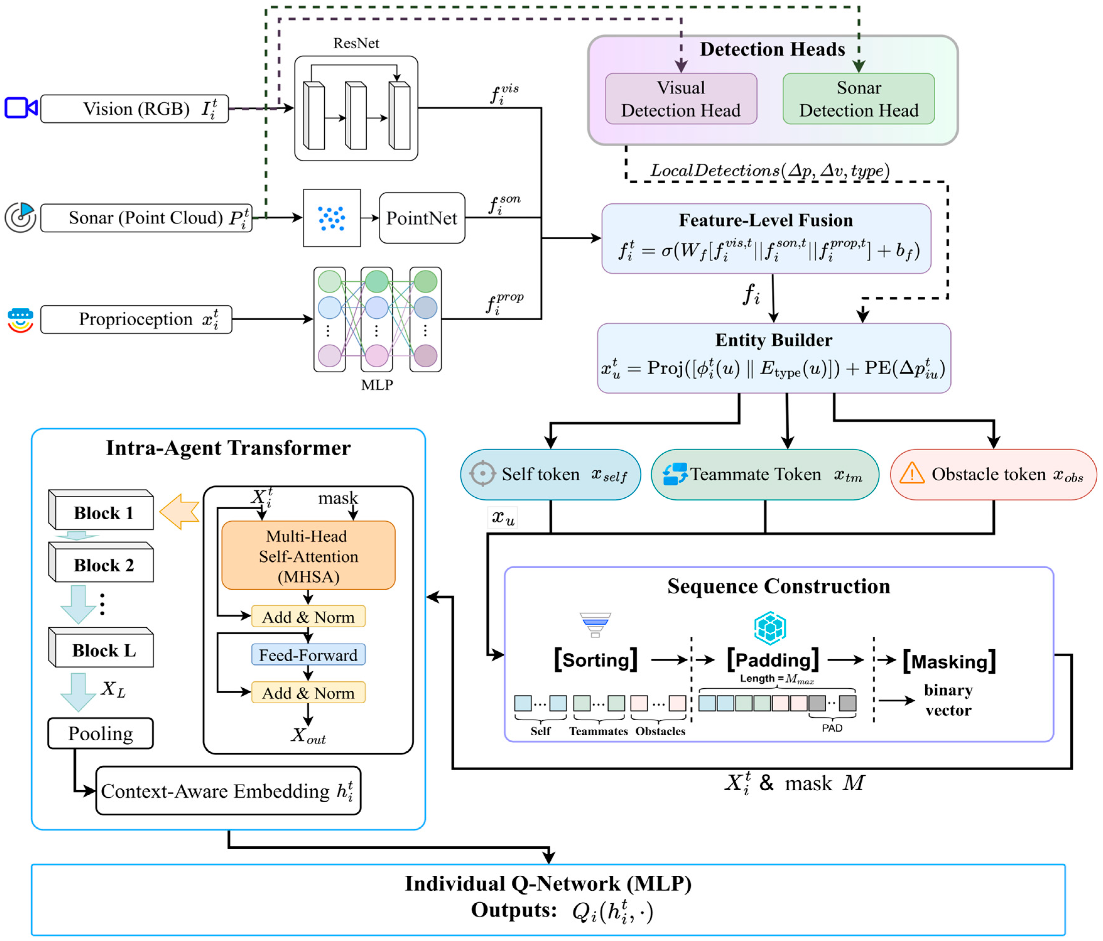- Nodes (V): The nodes of the graph are the entity tokens X generated by the Entity Builder (as described in Section 3.4.2), representing the agent itself, perceived teammates, and obstacles.