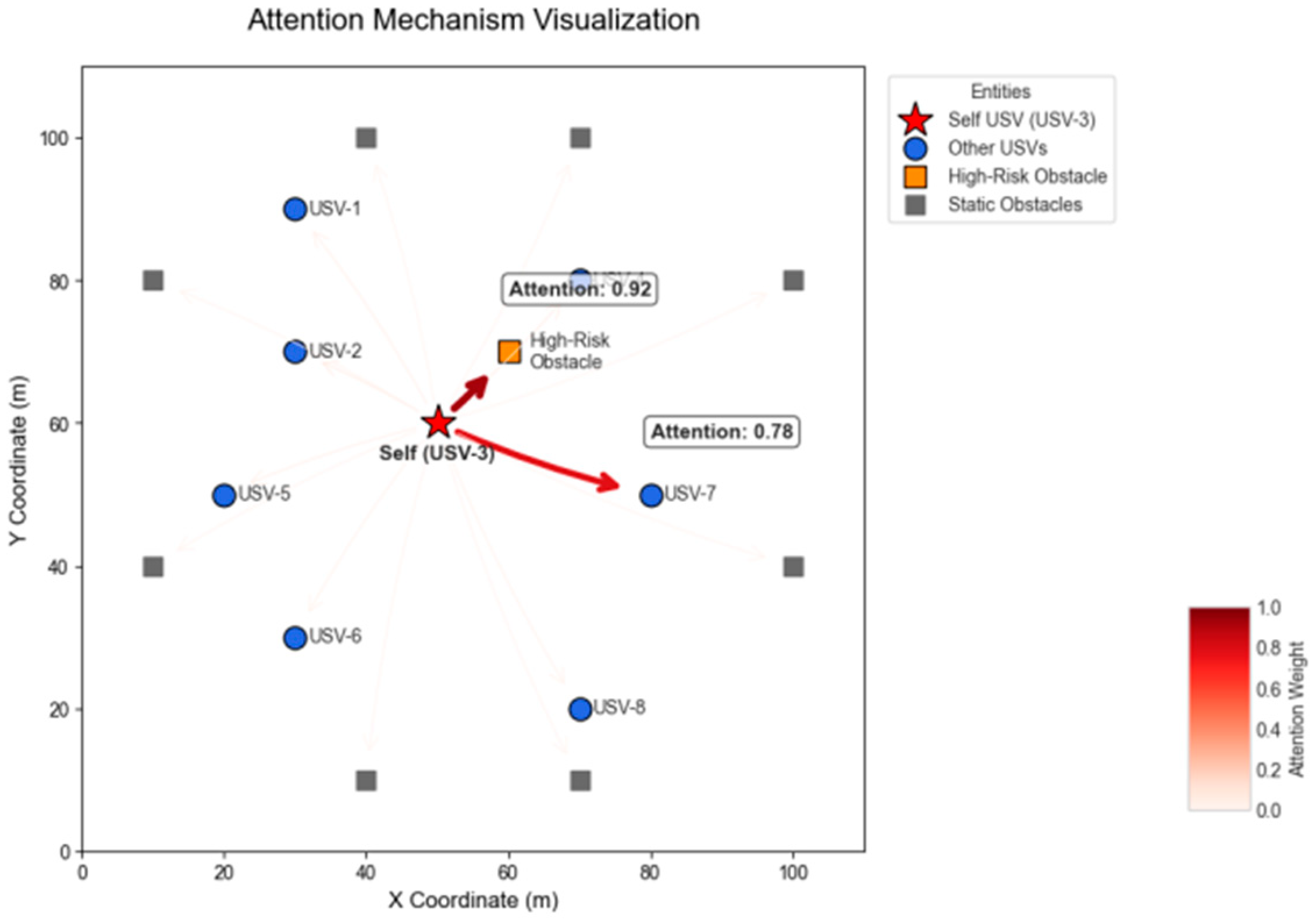 - TransQMIX Trajectory: In stark contrast, the TransQMIX agents demonstrate intelligent and proactive coordination that is qualitatively consistent with the principles of good seamanship. Well before the obstacle poses an immediate threat, the agents begin a smooth, coordinated evasive maneuver. USV-1 adjusts its course to port while USV-2 makes a complementary adjustment to starboard, creating a wide and predictable safe passage. This behavior mirrors the safe passage protocol for a head-on encounter as described in COLREGs Rule 14 (‘each shall alter her course to starboard’). More importantly, the action is decisive, early, and clearly communicates intent, preventing any ambiguity and ensuring a wide margin of safety, fully aligning with the spirit of Rule 8. This Behavior is not a pre-programmed rule but an emergent strategy learned through the Transformer’s ability to reason about the future consequences of joint actions.