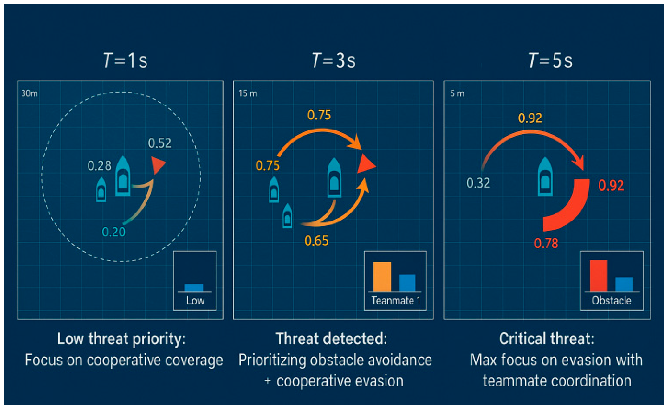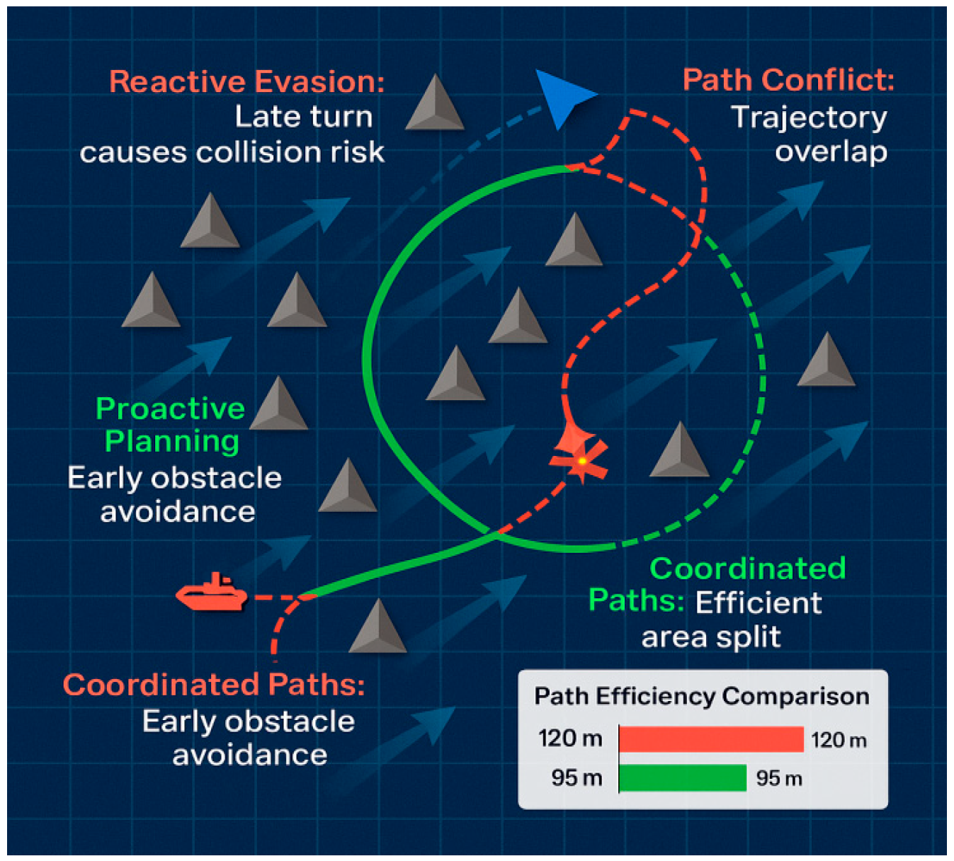 - QMIX Trajectory: The Behavior of the QMIX-controlled agents highlights the pitfalls of context-blind decision-making. As the dynamic obstacle approaches, the agents exhibit hesitant and reactive maneuvers. USV-1 makes a late, sharp turn, which inadvertently places it in the path of USV-2. This forces USV-2 into a conflicting evasive action, resulting in a near-miss between the teammates. This sequence of late and ambiguous maneuvers directly contravenes the principle of taking ‘positive action in ample time’ as stipulated in COLREGs Rule 8, creating a situation of unnecessary risk.