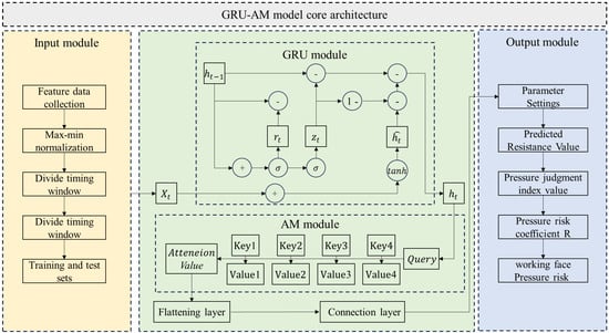 Working face strata pressure prediction in coal mines must address a complex, multi-dimensional, and dynamic data scenario, which traditional single algorithms struggle with, particularly in fully capturing time-series characteristics and the interrelation of key information. The GRU-AM model establishes a hybrid algorithm framework based on the GRU and the AM. On the one hand, it leverages the reset gate and update gate of the GRU to effectively capture long-term temporal dependencies in the strata pressure data, solving the vanishing gradient problem that often plagues traditional Recurrent Neural Networks when modeling long sequences. On the other hand, the AM assigns weights to the temporal features output by the GRU. This allows the model to automatically focus on the crucial strata pressure anomaly identification features, such as sudden changes in the dynamic load coefficient or abnormal shortening of the periodic weighting step. This model offers the following advantages when processing the multi-dimensional time-series data from hydraulic supports:
