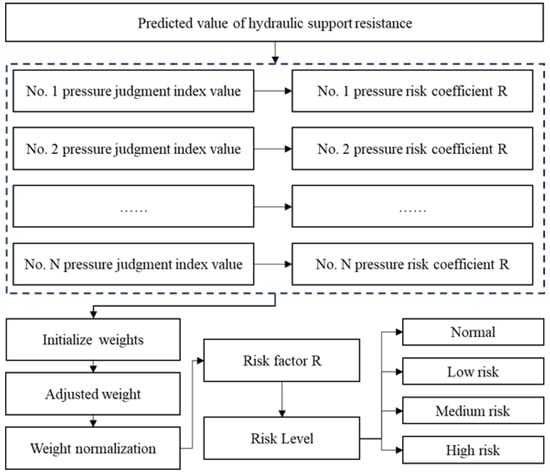 The process begins by calculating each support’s strata pressure assessment index value. This value is then used to determine the strata pressure risk coefficient for the single support. Following this, the model initializes weights, dynamically adjusts them based on the risk coefficients, and then applies normalization to finalize the weights. Finally, a comprehensive risk score is calculated, ranging from 0 to 1, and this score is used to categorize the risk into normal, low, medium, and high levels.