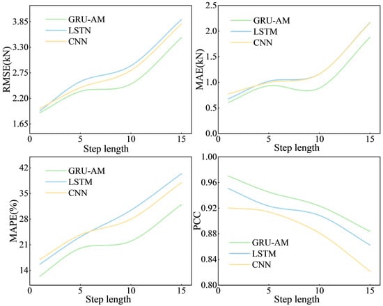 The GRU-AM model is superior to the LSTM and CNN models across all tested step lengths. Furthermore, the GRU-AM model shows a clear advantage in long-step prediction, demonstrating greater resilience and less affected by the increase in step length.