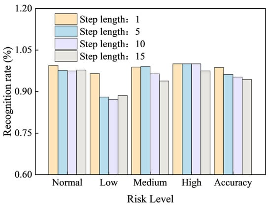 To more clearly illustrate the change in model identification rate as the step length increases, the table data were plotted into a bar chart (Figure 12) showing the state identification rate for the support number across 58 periodic cycles. Different colors in the figure represent different step lengths. As the step length increases, the F1 scores for normal, low, medium, and high risk and overall Accuracy all show a clear downward trend.