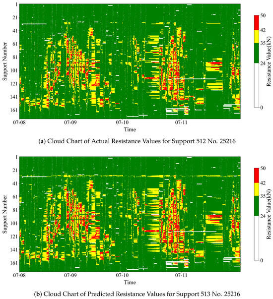 By comparing Figure 13a with Figure 13b, it is clear that the overall distribution trend of stress is similar between the two figures. High resistance corresponds to red and yellow colors, while low resistance corresponds to green. Crucially, the location and morphology of the high-resistance areas show a high degree of matching. This indicates that the model can capture the spatial distribution characteristics of the support resistance effectively and provides good prediction results for the resistance variation patterns in different areas of the working face.