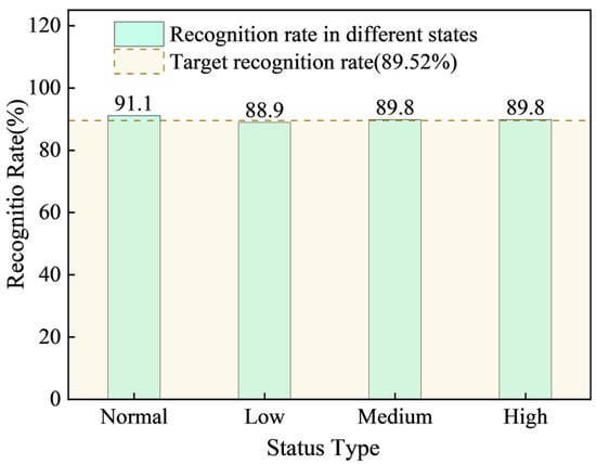 Figure 15 displays the bar chart showing the strata pressure anomaly identification rate for the working face at the mine in Baoji City, Shaanxi Province. As illustrated in Figure 15, at a 10 min prediction step length, the model demonstrated strong performance across all risk states: the identification rate for the normal state across all supports was 91.1%. The identification rates for low-, medium-, and high-risk states reached 88.9%, 89.8%, and 89.6%, respectively. The overall target identification rate was 89.52%. These results confirm that the model also exhibits good anomaly identification effectiveness in mines with similar geological conditions. This suggests that the model is highly adaptable and capable of effectively distinguishing between different risk levels and the normal state across different mine working faces.