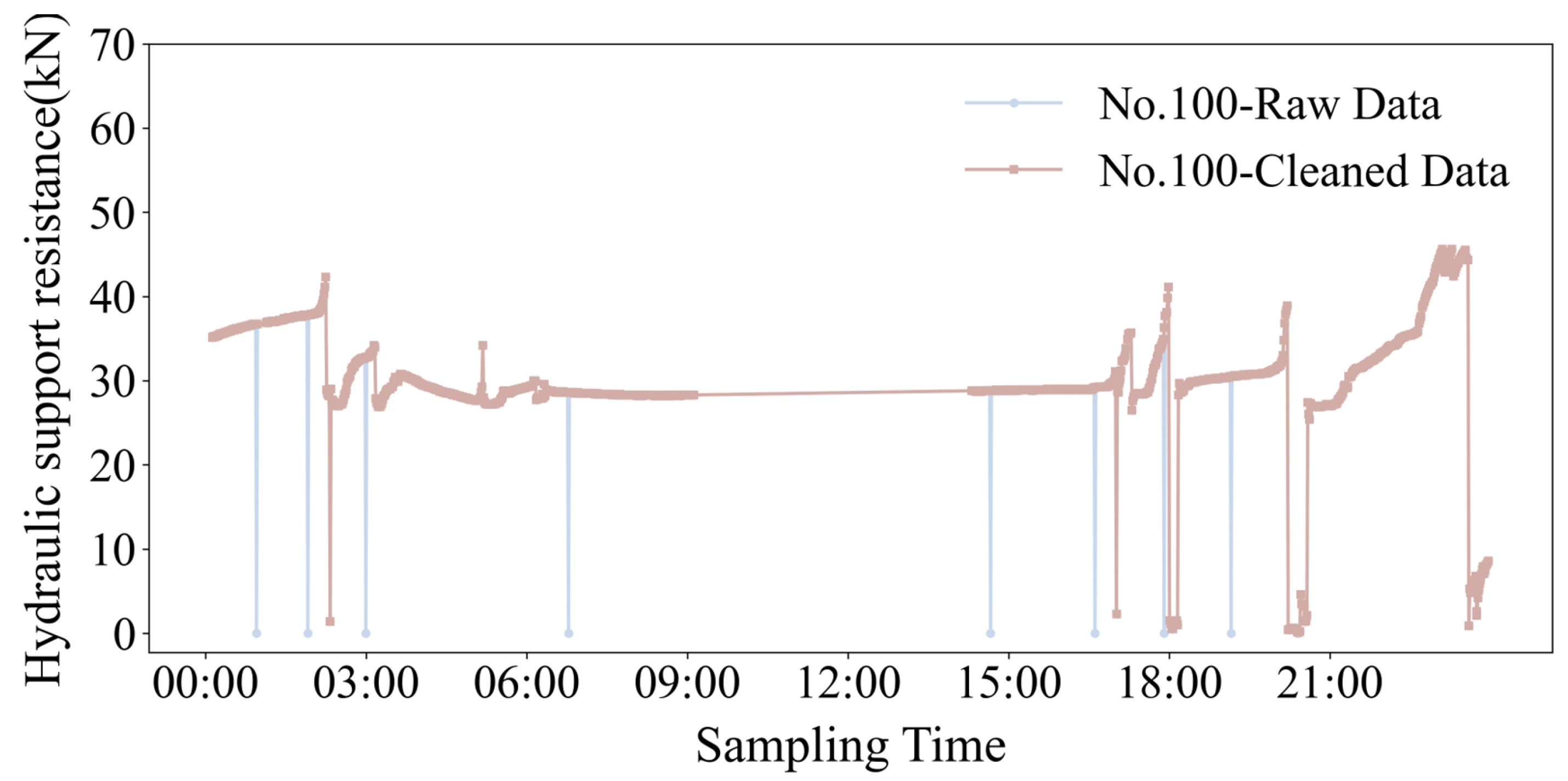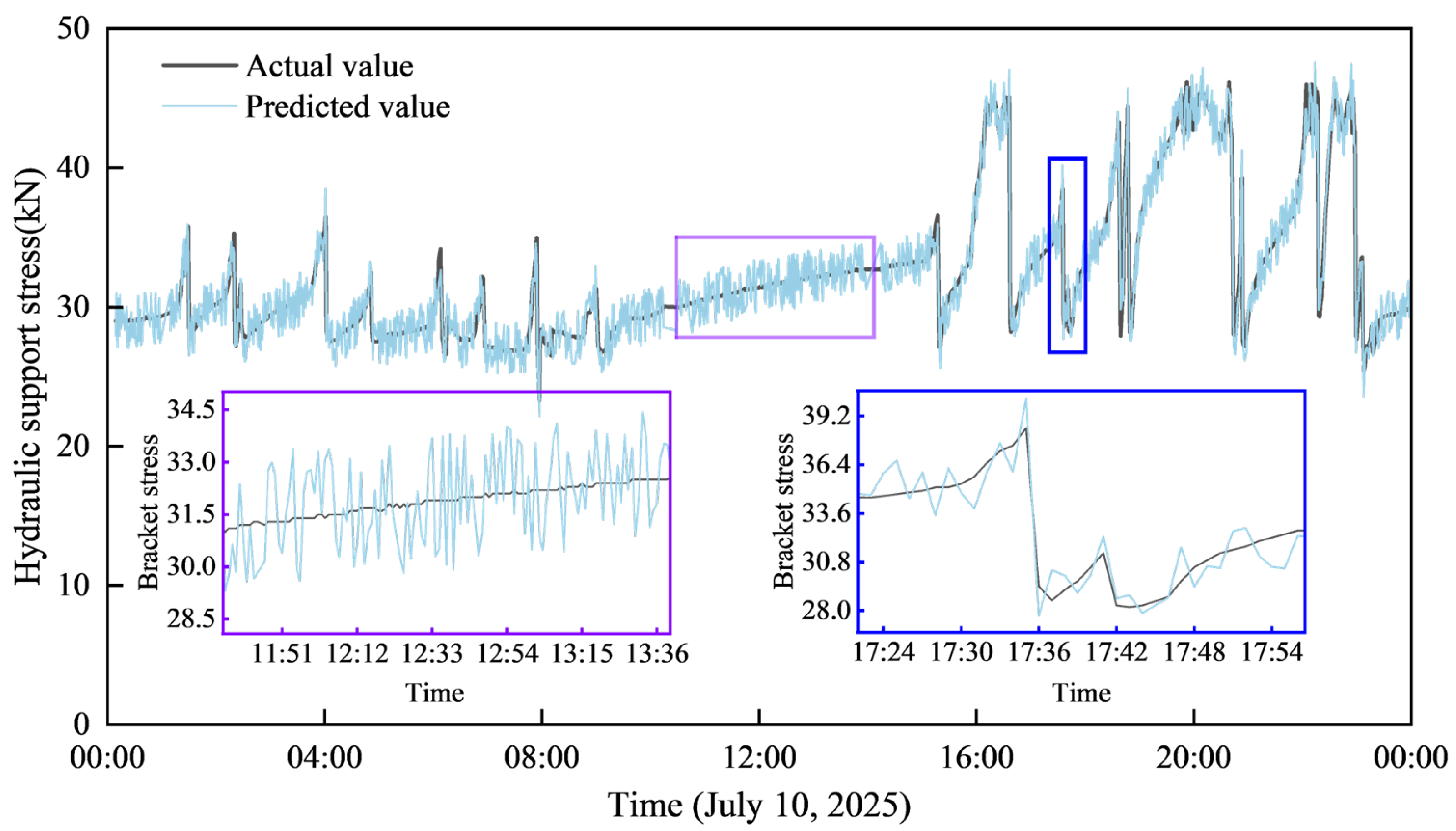 Figure 8 below illustrates the prediction performance of the resistance values across multiple hydraulic supports. The predicted and actual curves for all supports exhibit a high degree of consistency in their overall trend. During phases of stable resistance fluctuation, the predicted values closely track the dynamic characteristics of the actual values. Crucially, even when facing complex operating conditions, such as sudden resistance changes, the predicted curves can still capture the critical trends of these resistance variations.