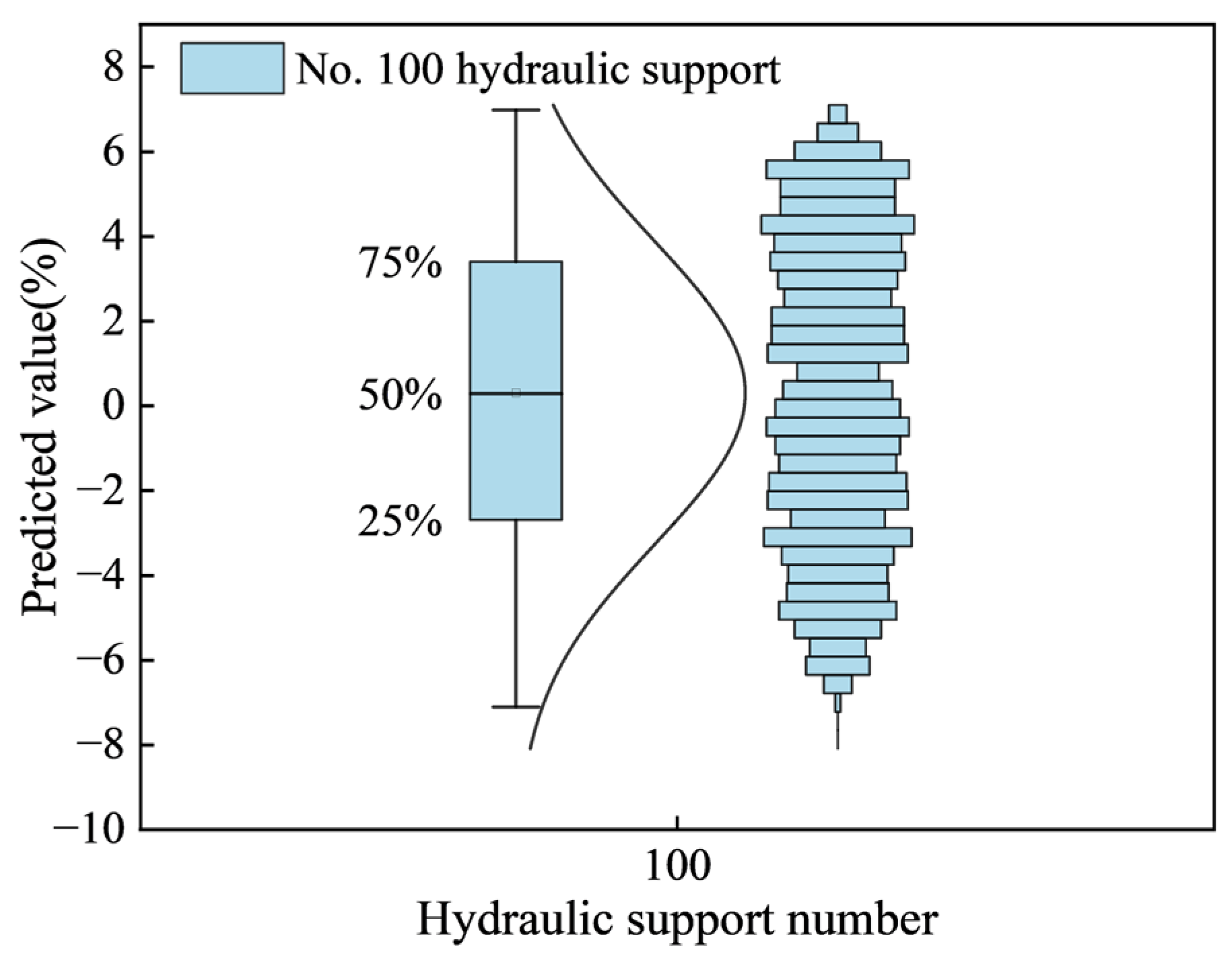 Figure 7 shows the relative deviation box plot of the resistance prediction value of support No. 100. The predicted value fluctuates continuously around the actual value. The maximum positive deviation observed is higher than the actual value, while the minimum negative deviation is lower than the actual value. Most of the predicted values are concentrated in the range of ±1% to ±2% of the corresponding actual value. In addition, the average value of the predicted value is the actual value of the corresponding time step. This shows that the predicted value is very close to the actual value, and the prediction Accuracy is high.