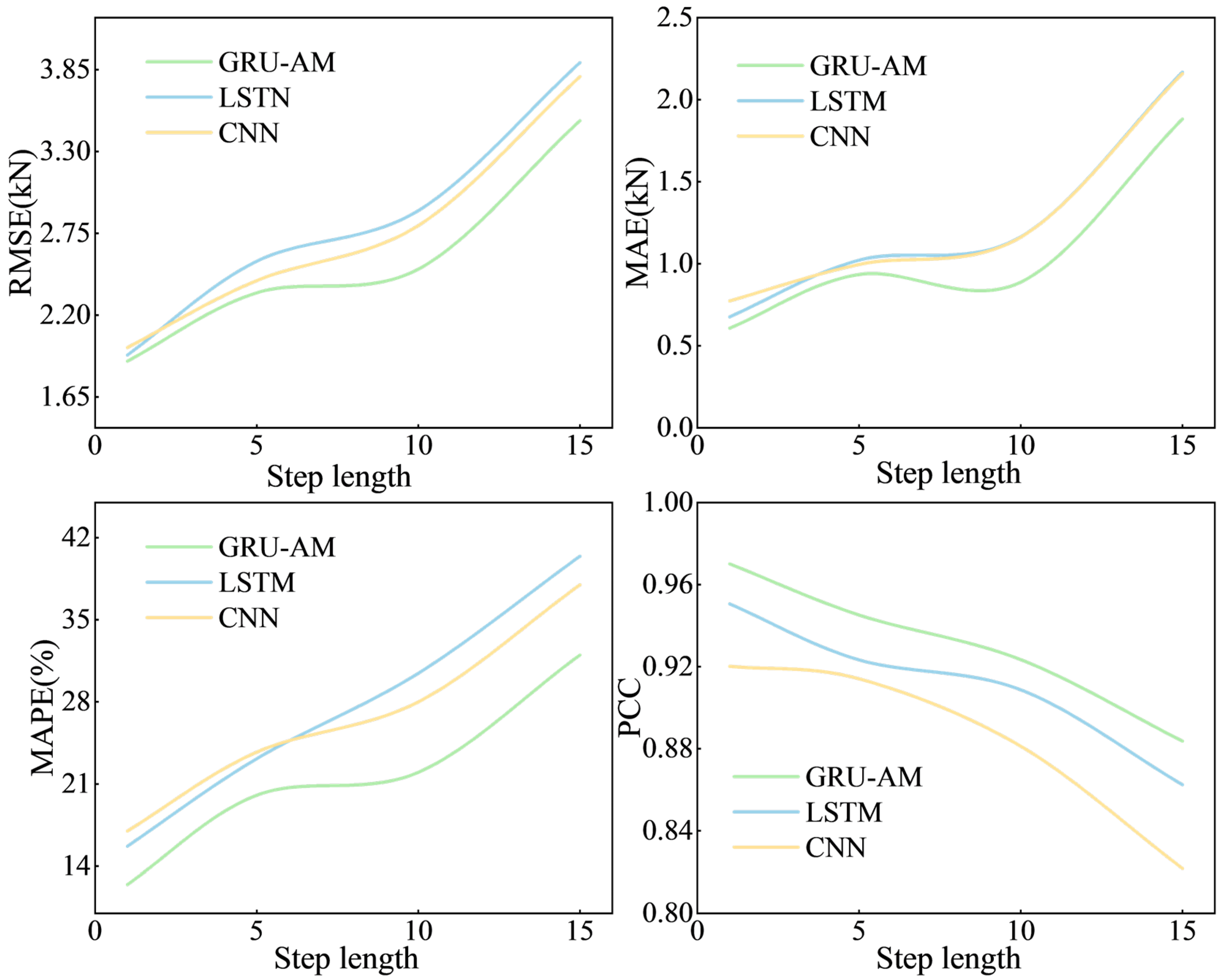The GRU-AM model consistently demonstrates the best performance across all step lengths. Its error metrics are significantly lower than the LSTM and CNN models, and the GRU-AM model maintains a higher value.