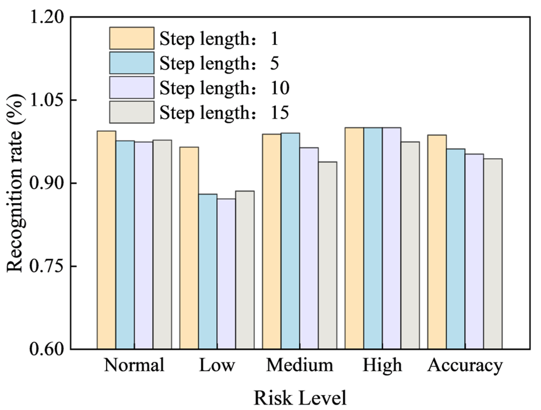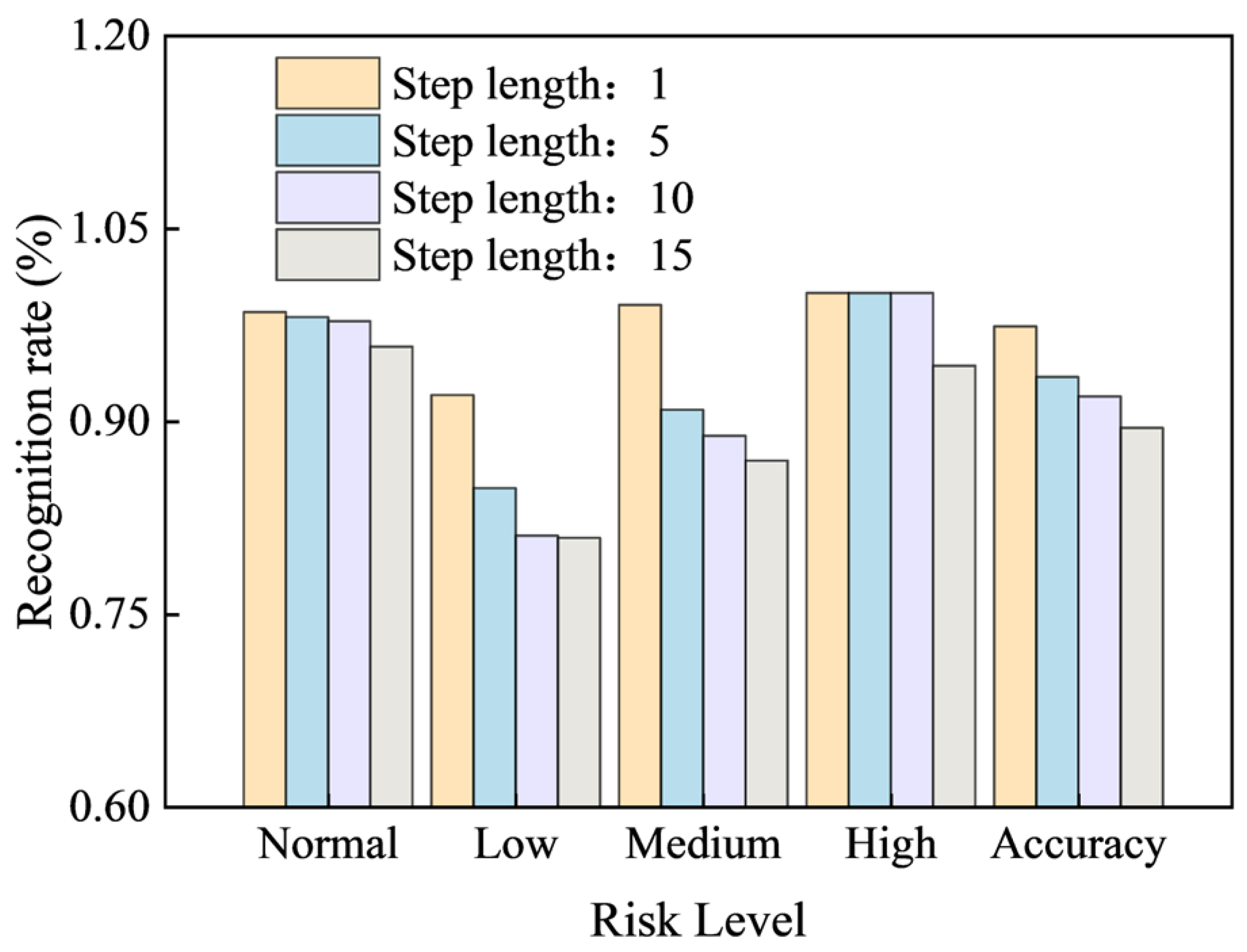 Figure 12) showing the state identification rate for the support number across 58 periodic cycles. Different colors in the figure represent different step lengths. As the step length increases, the F1 scores for normal, low, medium, and high risk and overall Accuracy all show a clear downward trend.