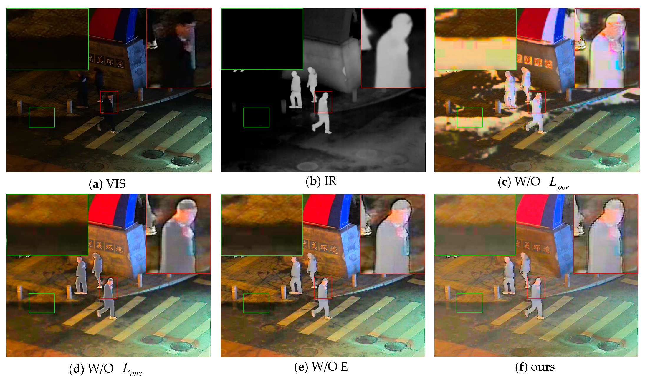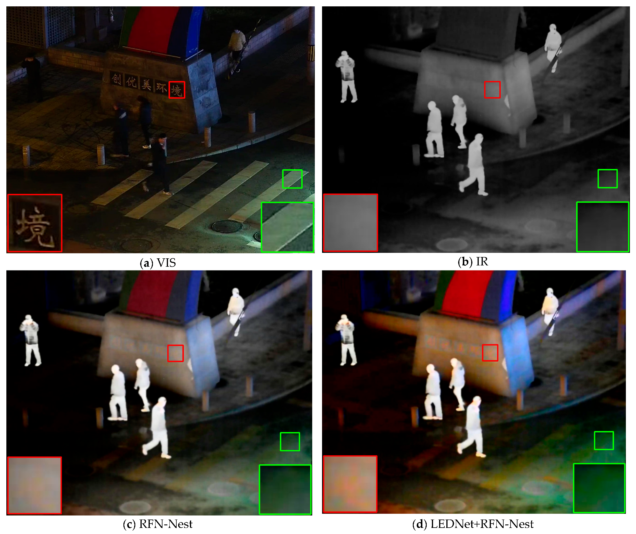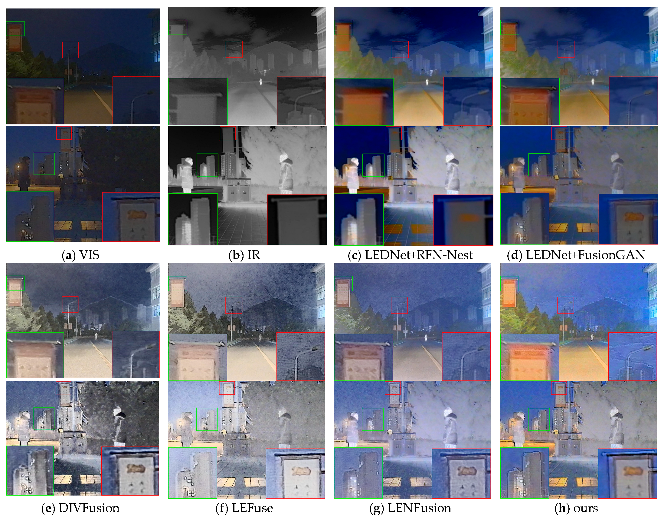 - Cheng, M.; Huang, H.; Liu, X.; Mo, H.; Zhao, X.; Wu, S. LEFuse: Joint low-light enhancement and image fusion for nighttime infrared and visible images. Neurocomputing 2025, 626, 129592. [Google Scholar] [CrossRef]
