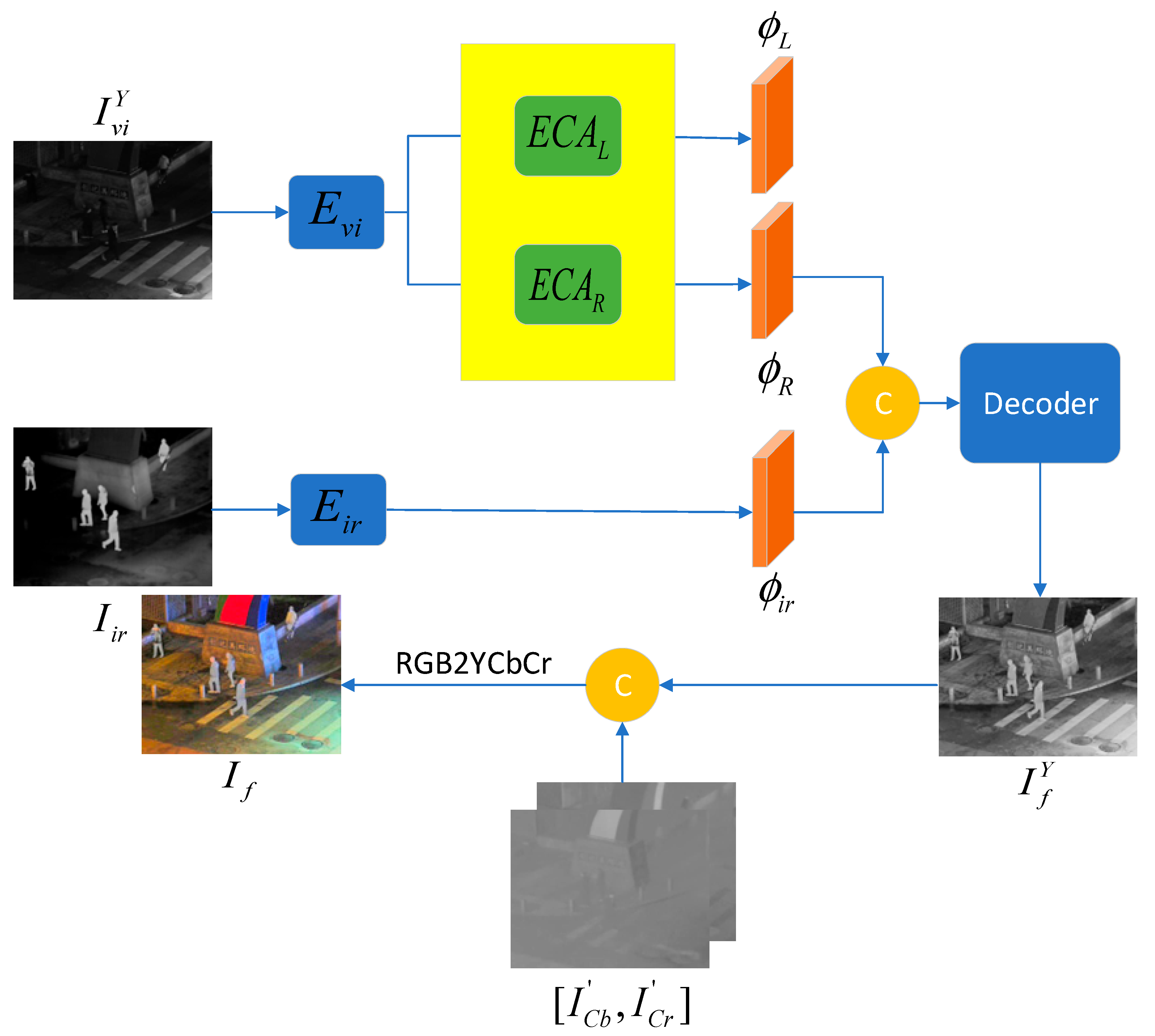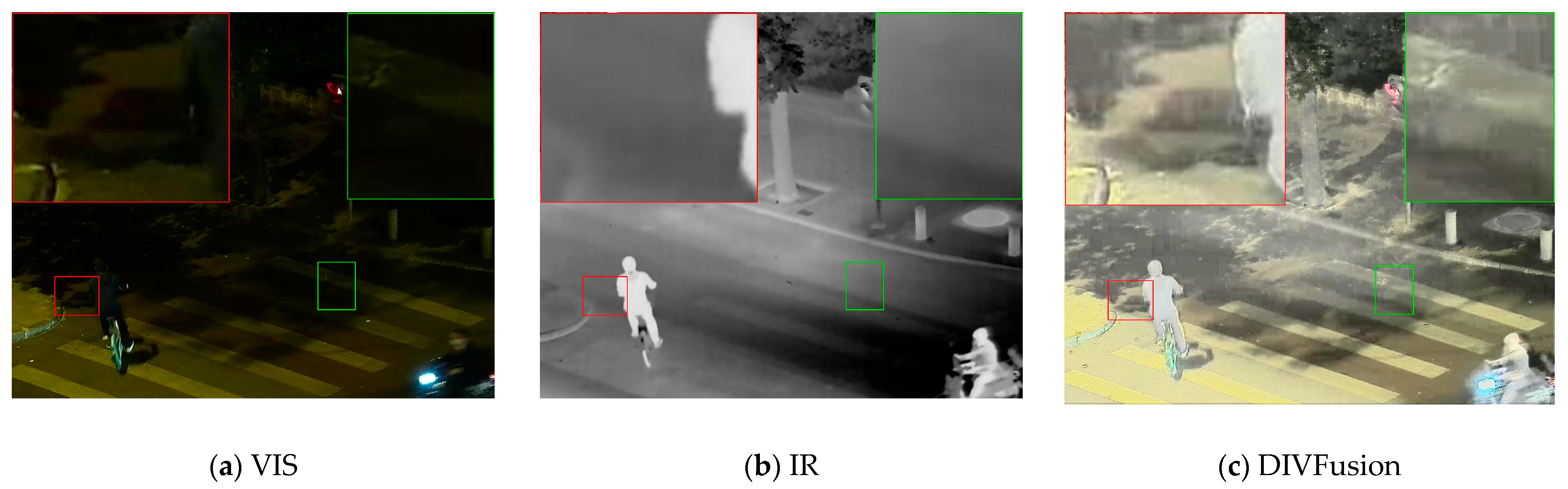 - Tang, L.; Xiang, X.; Zhang, H.; Gong, M.; Ma, J. DIVFusion: Darkness-free infrared and visible image fusion. Inf. Fusion 2023, 91, 477–493. [Google Scholar] [CrossRef]