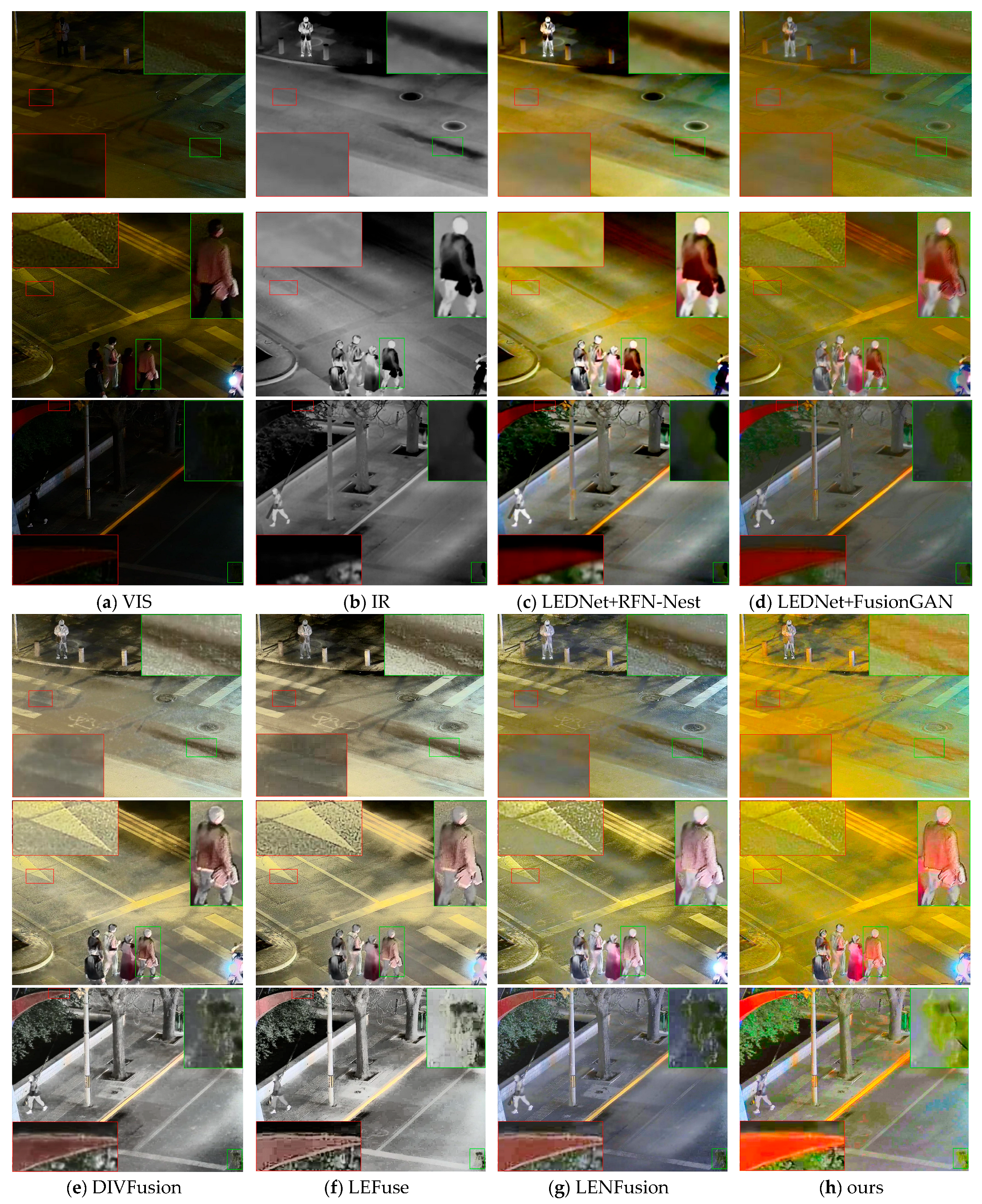 - Chen, J.; Yang, L.; Liu, W.; Tian, X.; Ma, J. LENFusion: A Joint Low-Light Enhancement and Fusion Network for Nighttime Infrared and Visible Image Fusion. IEEE Trans. Instrum. Meas. 2024, 73, 1–15. [Google Scholar] [CrossRef]