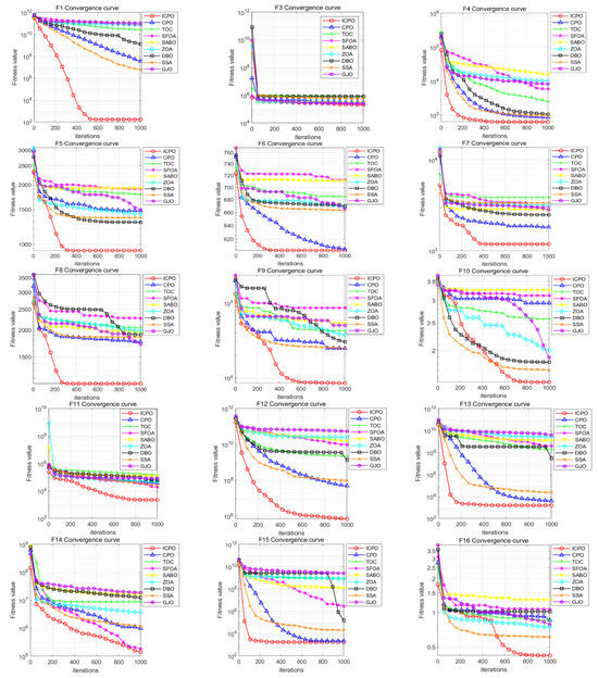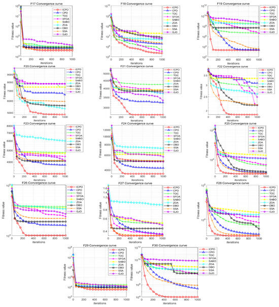To rigorously assess the effectiveness of the proposed ICPO algorithm, we conducted a series of tests using 29 standard benchmark functions from the CEC2017 test suite. The performance of ICPO was compared against eight other state-of-the-art algorithms: CPO, TOC, SFOA, SABO, ZOA, DBO, SSA, and GJO. The benchmark test functions are summarized in Appendix A. The test functions are categorized as follows: