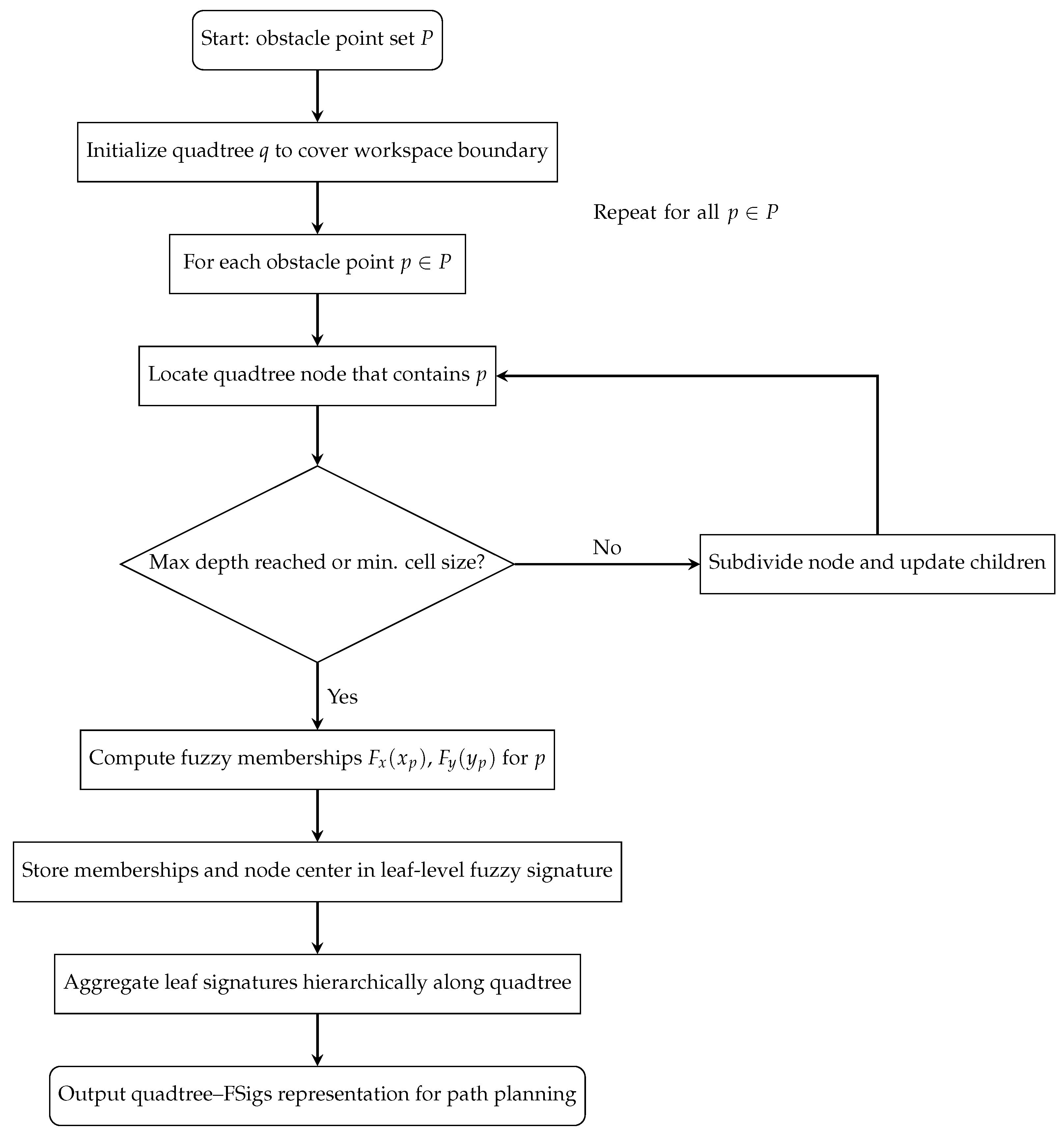 | Primary Data Structure | Often uses linear rule-bases, sensor models, or dynamic windows [21,22]. | Nested vectors or graphical FSigs focused on symbolic data [24,25,26]. | Quadtree-organized hierarchical FSigs combined with path planning |