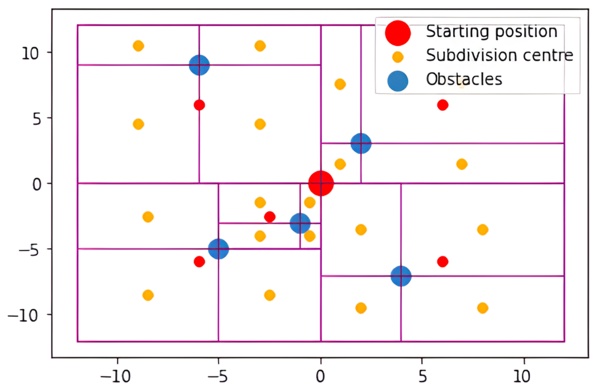 - For each point p in the set P, divide the space as needed and place p at the center of the newly formed sector. Identify the fuzzy sets associated with p and save them alongside their coordinates. Modify the membership function of the obstacle to represent its specific properties. Create four child nodes for each node, defining their subdivided boundaries in advance but leaving their values unassigned for now.