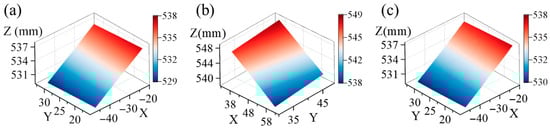 The ceramic plate was coated with water-transfer speckles, with an average speckle diameter of about 3–5 pixels. It was mounted on a high-precision three-axis translation stage (precision of 5 μm) and positioned within the common field of view of four virtual cameras. The overlap area was approximately one-fifth of the total length of the image, and a region of 192 × 308 pixels was selected as the region of interest (ROI). Initially, the morphology of the ceramic plate was measured, as depicted in Figure 5. Figure 5a is obtained by subsystem 1, Figure 5b is obtained by subsystem 2, and Figure 5c is the transformed data of subsystem 2 to the OCC of subsystem 1.