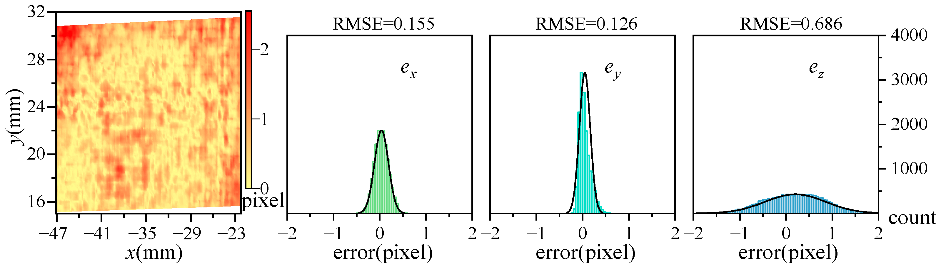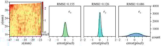 Figure 6 displays the errors outcomes when comparing three-dimensional data measured by Subsystem 2 against data from Subsystem 1: left, absolute error distribution; right, three directional errors statistics. The error in the y-direction is notably minimal, and the RMSE is 0.126 pixels. Errors in the x-direction are also small, and the RMSE is 0.155 pixels. The z-direction shows higher relative errors with an RMSE of 0.686 pixels, yet over 85% of data points maintain errors less than 1 pixel. These results affirm a strong agreement in the data from overlapping regions measured by the two subsystems.