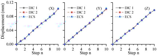 During the translational experiments, a translation stage was employed to displace the ceramic plate along a predefined linear path. Throughout the motion, speckle images were simultaneously captured by both cameras to measure the pure translational displacement of the plate. For validation purposes, an eddy current sensor (ECS) with a sensitivity of 2 μm was used as a reference to monitor the displacement. Manual adjustments were made to the differential micrometer head on the translation stage, advancing the plate in ten sequential steps of 10 μm each. As illustrated in Figure 7, a comparative analysis reveals a high level of agreement between the displacement values obtained from the multi-camera DIC system and those recorded by the ECS, which demonstrate that the proposed method achieves a high precision.
