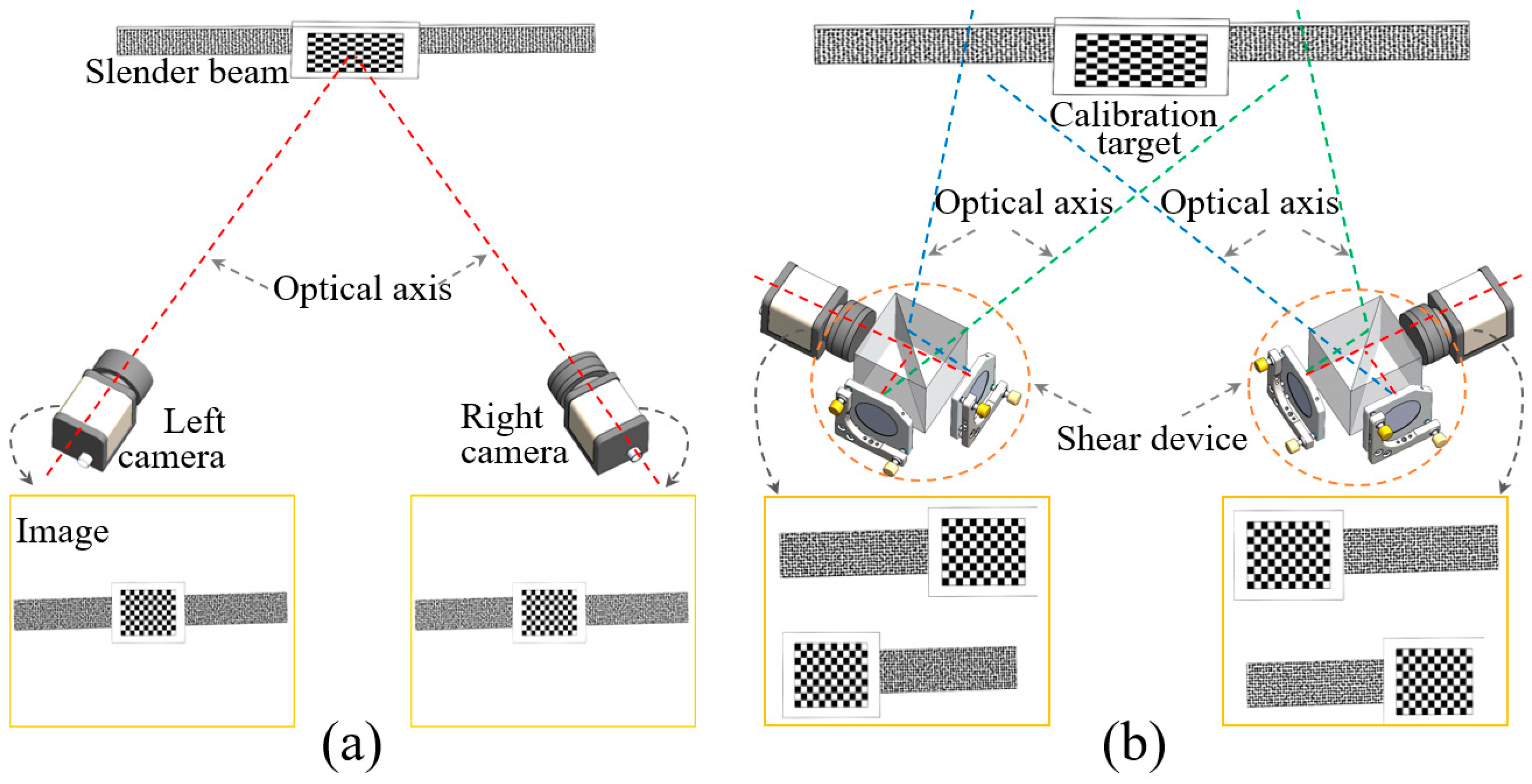 14] to acquire comprehensive data of the slender object. Typically, the slender objects studied are of meter or decimeter scale, found in large engineering structures where the measurement environment has ample space allowing the multiple cameras to be optimally positioned. Conversely, the minor dimensions of slender objects referred to as slender components in mechanical systems typically range from centimeters to decimeters, necessitating that test cameras be positioned close to the object to resolve details. This proximity results in a testing environment that lacks sufficient space to accommodate multiple cameras. An effective strategy to address this challenge is to transform a single camera into two virtual cameras, which is achieved by employing optical devices to generate two distinct viewpoints.