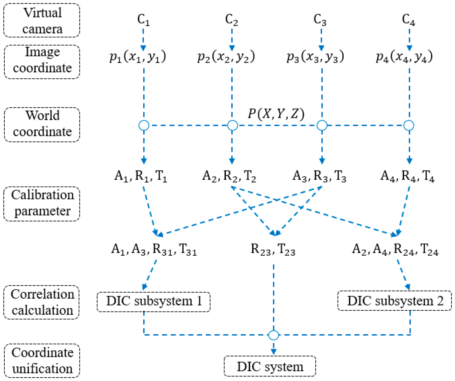 14]. The relationship between the OCC systems of camera 1 and camera 3 consisting of DIC subsystem 1 can be expressed as follows: